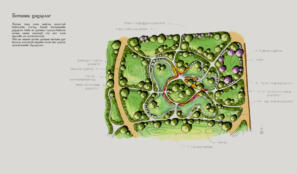 Та яг одоо паркийн төслийн үндсэн концепцийг илэрхийлсэн зураглалыг харж байна. Зурагт харагдаж буйгаар цэцэрлэгт хүрээлэнгийн 80 хувь нь өөрөө өөрийгөө нөхөн сэргээх боломжтой ногоон байгууламж, 20 хувь нь тухлах талбай болон дасгал хөдөлгөөн хийх орчин байх юм. Мөн автомашины зогсоолгүй гэдгээрээ онцлогтой бөгөөд олон нийтээс ирсэн саналын дагуу их хотын дуу чимээнээс хол, агаарын бохирдол багатай, хүүхдүүдэд аюулгүй шийдэл юм.
