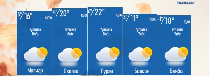 Улаанбаатарт өнөөдөр цэлмэг, зөөлөн салхитай. Агаарын температур 17 цагийн байдлаар 20 градус дулаан байх бол 20 цагийн үед 14 градус дулаан байх төлөвтэй байна. Энэ долоо хоногт нийслэл хотод өдөртөө 10-22 градусын дулаан байна. Пүрэв, баасан гарагт ялимгүй хур тунадас орж, баасан бямба гарагт бага зэрэг сэрүүсэж 10-11 градусын дулаан.