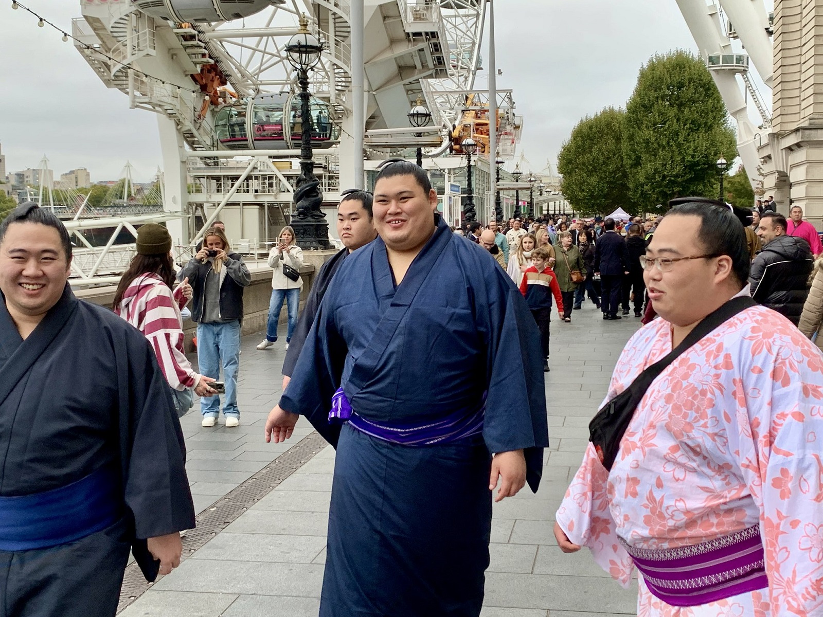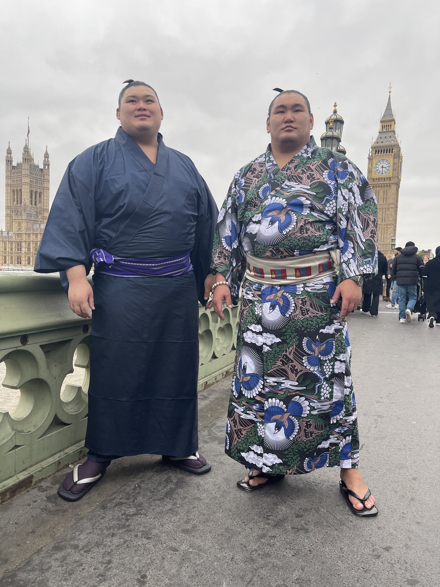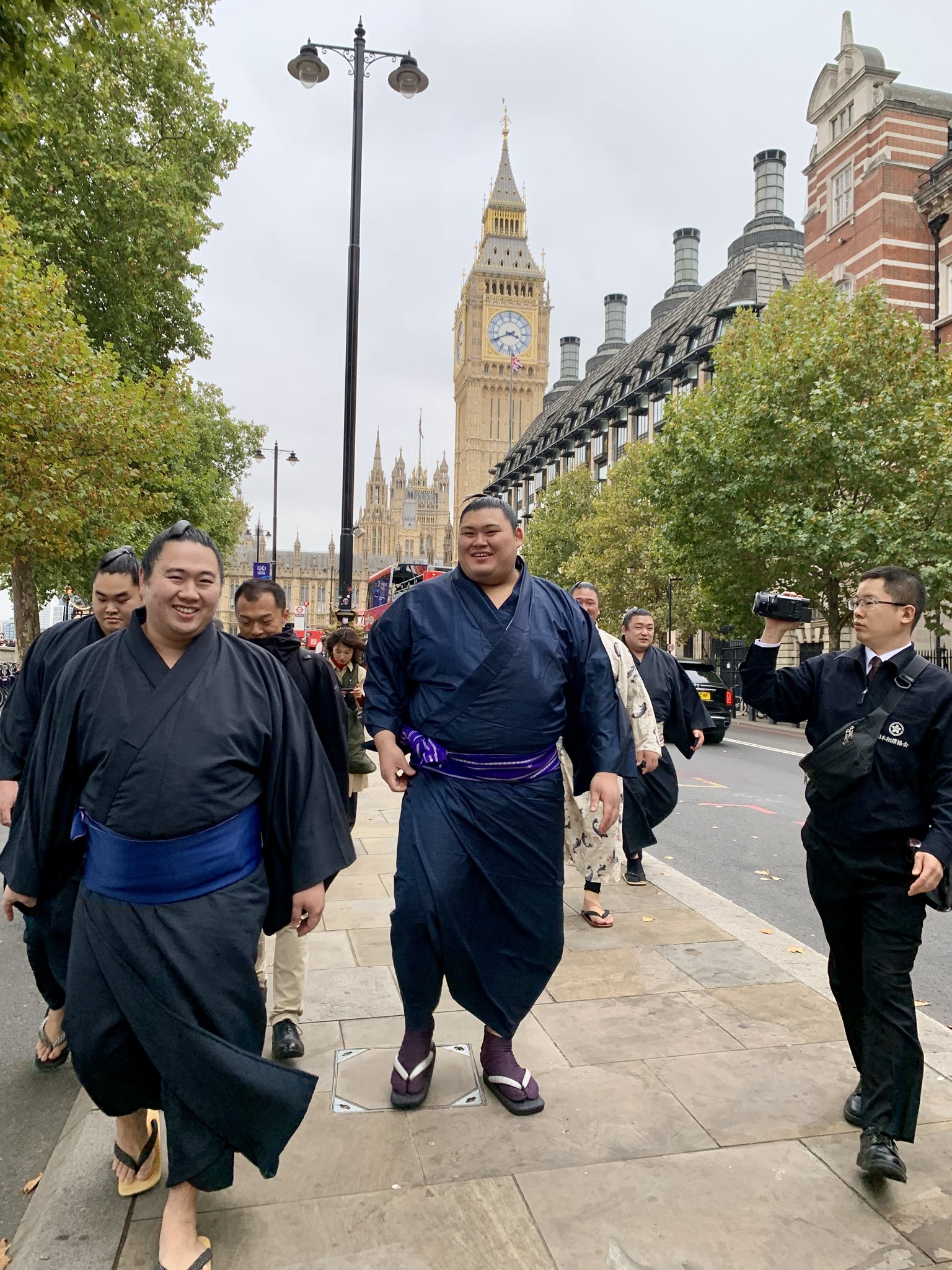 Лондон хотын гудамжаар асар том биетэй, кимонотой, магэ үстэй бөхчүүд зугаалж явах нь харагдах болж, англичууд гайхан, хамт зураг авхуулдаг болоод байна.