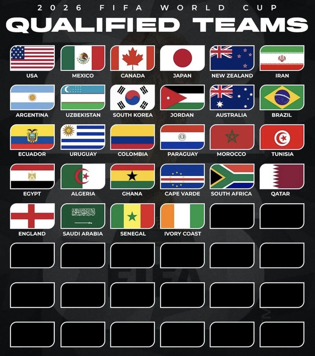 Ирэх 2026 оны зургадугаар сарын 11-нээс долдугаар сарын 19-нд болох хөлбөмбөгийн Дэлхийн аварга шалгаруулах 23 дахь удаагийн тэмцээнд анх удаагаа 48 орны шигшээ баг оролцоно гэдгийг бүгд мэдэж буй биз ээ. Тэгвэл өнөөдрийн (2025.10.14) байдлаар эдгээр 48 багаас 28-ынх нь нэр тодорхой болоод байна.