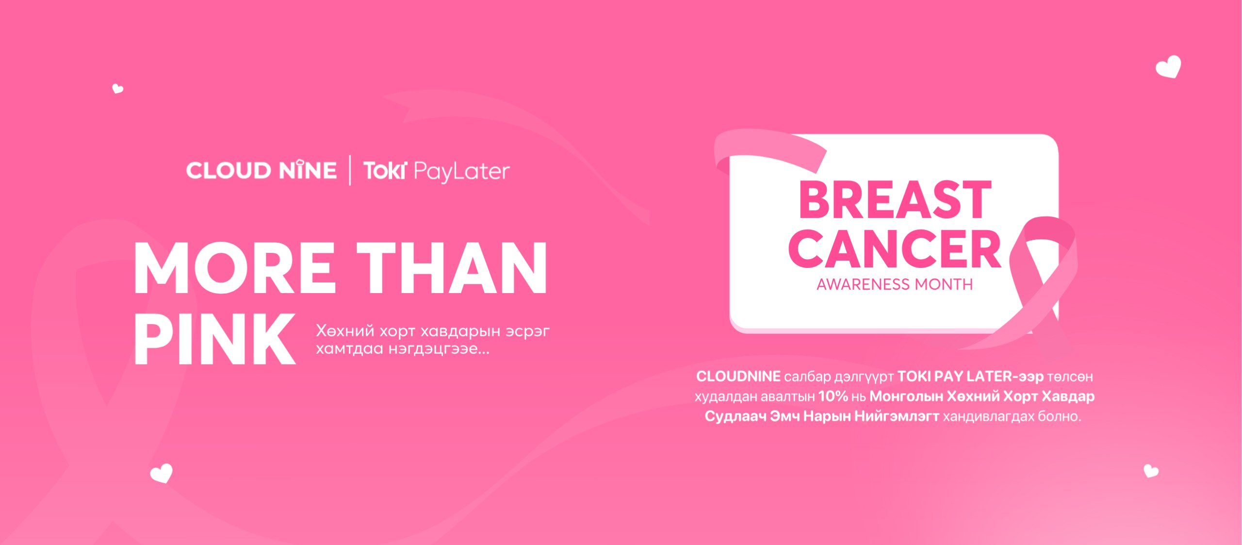 Энэ жил Toki PayLater ба Cloud Nine хамтдаа “More than Pink” хөтөлбөрөөр аравдугаар сарыг та бүхэндээ онцолж байна. Энэхүү санаачилга нь зөвхөн гоо сайхны тухай биш, харин амьдрал, итгэл, эмэгтэйчүүдийн хүч чадлын тухай билээ. Тэдний хамтын ажиллагааны хүрээнд энэ аравдугаар сарыг дуустал Cloud Nine дэлгүүрээс Toki PayLater-ээр төлбөр хийсэн худалдан авалт бүрийн 10% нь “Монголын Хөхний Хорт Хавдар Судлаач Эмч Нарын Нийгэмлэг (НҮТББ)”-т хандивлагдана. Мөн PayLater ашигласан хүн бүр гарын бэлэгтэй!