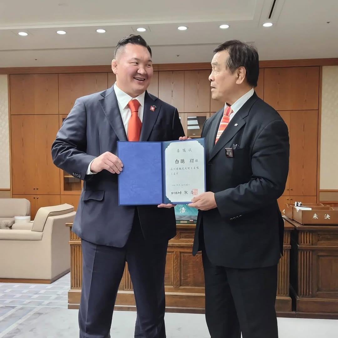 -Мэргэжлийн сүмо бөхийн ёкозүна асан Хакүхо Японы Ишикава мужийн аялал, жуулчлалын элч төлөөлөгчөөр сонгогдлоо. Газар хөдлөлт, цүнамид өртөөд байгаа тус мужийг цэцэглэн, хөгжүүлэх их үйлсэд манай аварга нэгдэж байгаа юм.