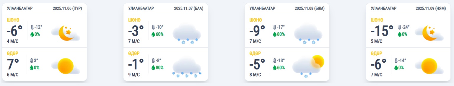Пүрэв гарагаас баасанд шилжих шөнө Өвөрхангайн нутаг, Архангайн зүүн, Булганы өмнөд, Төв аймгийн баруун хэсгээр, 7-ны өдөр Төв аймаг, Хэнтийн нутгаар ахиухан хэмжээний цас орно. Мөн маргааш Баянхонгорын зүүн, 6-7-нд шилжих шөнө Дундговийн хойд, 7-ны өдөр Сэлэнгийн нутаг, Сүхбаатарын хойд хэсгээр их цас орно.