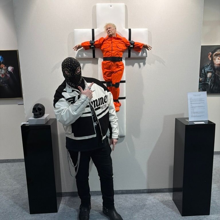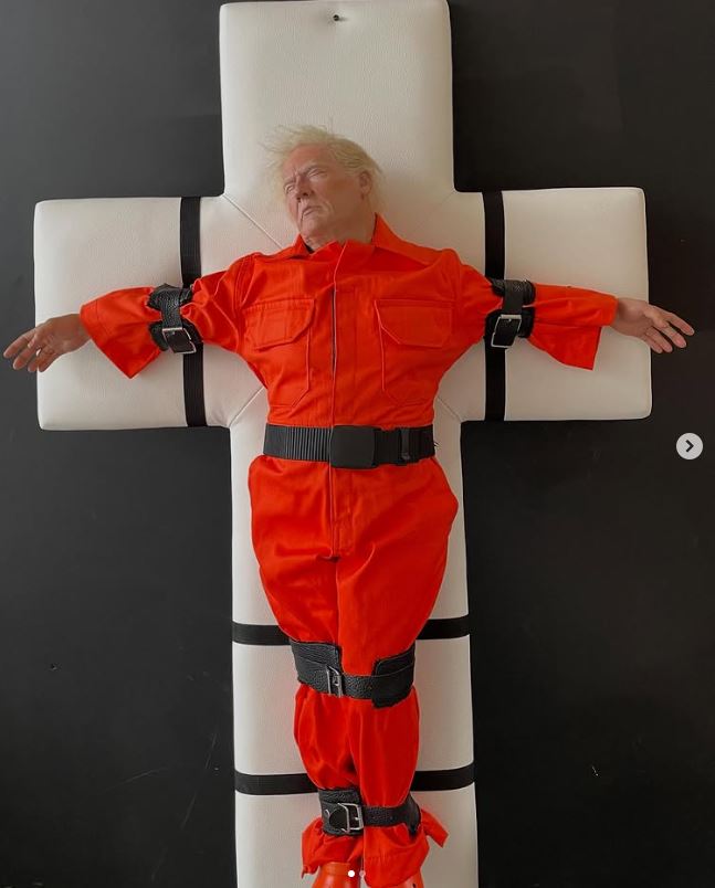 “Гэгээнтэн үү? Нүгэлтэн үү?” баримлын талаар өгүүлэхэд Ерөнхийлөгч Дональд Трамп бодит хэмжээгээрээ (1,47 × 0,83 м) бүтээгдсэн. Загалмай дээр хэвтэж байх бөгөөд буюу АНУ-ын шоронд хоригдлууд өмсдөг улбар өнгийн комбинезонтой. Хэвтэж байгаа загалмай нь цаазаар авахад хэрэглэдэг үхлийн тарианы дамнуурга мэт.