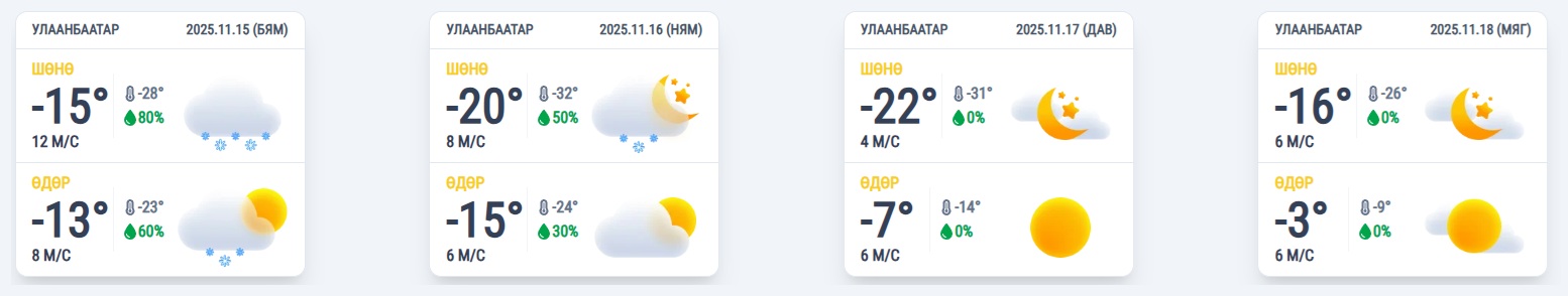 Өнөө шөнө Сэлэнгэ, Дархан-Уул аймгийн нутаг, Төв аймгийн баруун болон хойд, Хэнтийн хойд хэсгээр, 15-ны өдөр Дорнодын хойд хэсгээр цасан шуурга шуурна. Маргааш буюу 15-нд төвийн аймгуудын нутгийн зүүн, зүүн аймгуудын нутгийн хойд хэсэг, 16-нд зүүн аймгуудын нутгийн зүүн хэсгээр цас орж, цасан шуурга шуурч, үзэгдэх орчин хязгаарлагдаж, зам даваа гүвээнд халтиргаа гулгаа үүсэж, ихэнх нутгаар хүйтний эрч эрс чангарч, говь, тал, хээрийн нутгаар салхи шуургатай байхыг анхааруулж байна.