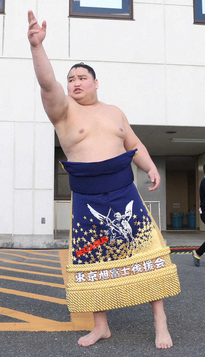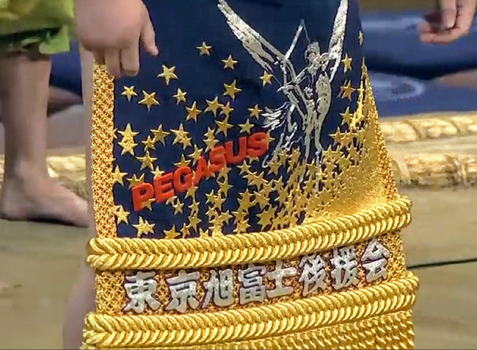 Шёовагийн сүүл үеэс Хэйсэй эрин хүртэл барилдсан 63 дахь ёкозүнагийн ёслолын мавашиг 35 жилийн өмнө хийсэн эд. Pegasus гэсэн бичиг, далавчтой морь, од гаригийн зурагтай, доод талд нь “Асахифүжиг дэмжигчдийн Япон дахь нийгэмлэг” гэсэн бичигтэй. Б.Очирсайханыг дохён дээр гарахад бүгд алга ташин, алдарт аваргын ёслолын мавашиг дахин нэг шимтэн харч байлаа.