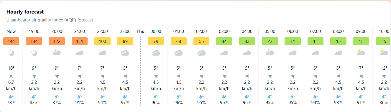 Харин өчигдөр шөнийн 02,30 минутад Улаанбаатарын агаарын индекс 144-т хүрч, эрүүл мэндэд аюултай түвшинд хүрчээ. Өвлийн хүйтэн эхлээгүй, галлалт болоогүй байхад маш эрт дэлхийд утааны сөрөг чансааны дээгүүр давхиад эхэлжээ, бид.