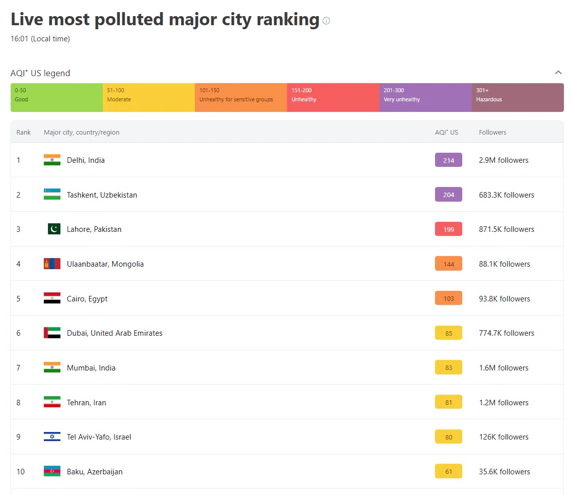 Олон улсын экологийн AirVisual хэмээх цахим хуудас дэлхийн хотуудын экологийн байдлыг онлайнаар шууд дамжуулан харуулдаг билээ. Өнөөдрийн байдлаар дэлхийд хамгийн агаарын бохирдолттой хотоор Энэтхэгийн Дели хот шалгарч явна. Агаарын чанарын индекс 50 байх ёстой бол Дели хотынх одоогоор 214 гэсэн тоо гараад байна. Делигийн дараа Узбекистаны Ташкент, Пакистаны Лахор хотууд орсон байна.