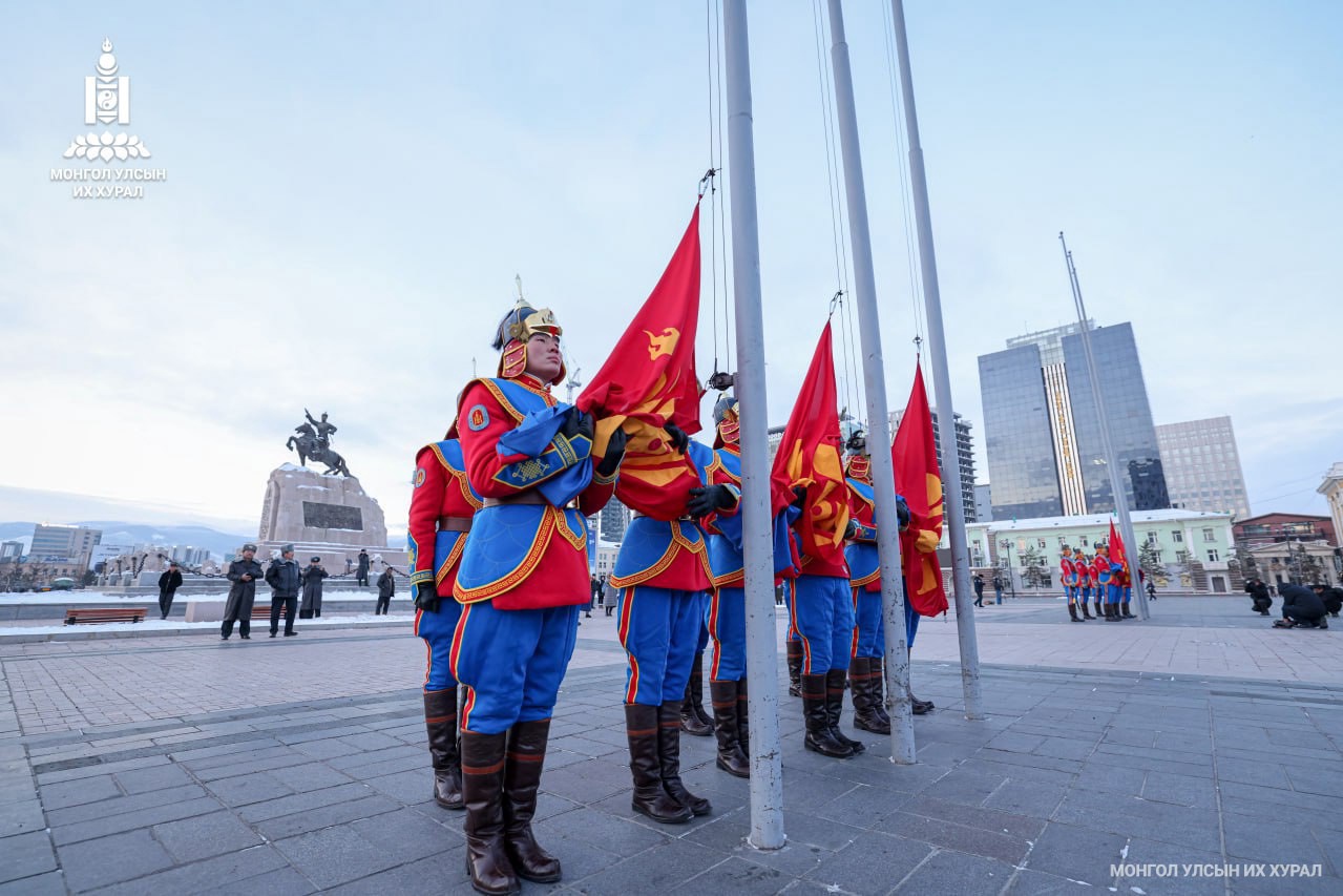 Төрийн далбаа мандуулах ёслолын хүрээнд хүндэт харуулууд Төрийн ордны урд талын баруун, зүүн жигүүрээс жагсаалын алхаагаар алхаж, улмаар Их жанжин Д.Сүхбаатарын хөшөөний хойно байрлах Төрийн далбааны сууринд далбаа баригч төрийн ёслолын журмын дагуу далбааг бэхлэн мандуулав.