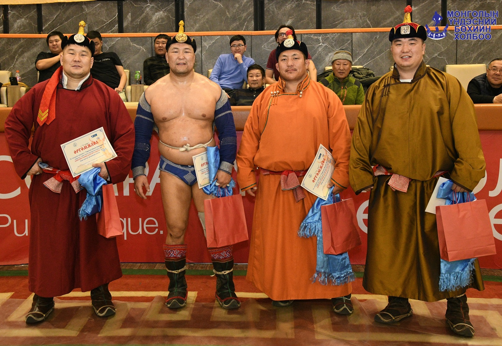 Дөрөвт Завхан аймгийн Нөмрөг сумын харьяат, "Хилчин" спорт хороо, ХЦ-0208 анги, Алтангадас ХХК, Жем Интернэйшнл ХХК, Завхан Даян дэвжээний бөх, улсын харцага Д.Бат-Эрдэнэ, Өвөрхангай аймгийн Зүүнбаян-Улаан сумын харьяат, "Алдар" спорт хороо, ЗХ-337 анги, АПУ ХК, Чиглэл ХХК, "Их Монголын Хүчтэн" дэвжээний бөх, улсын харцага Б.Цэдэнсодном нар шалгарлаа.