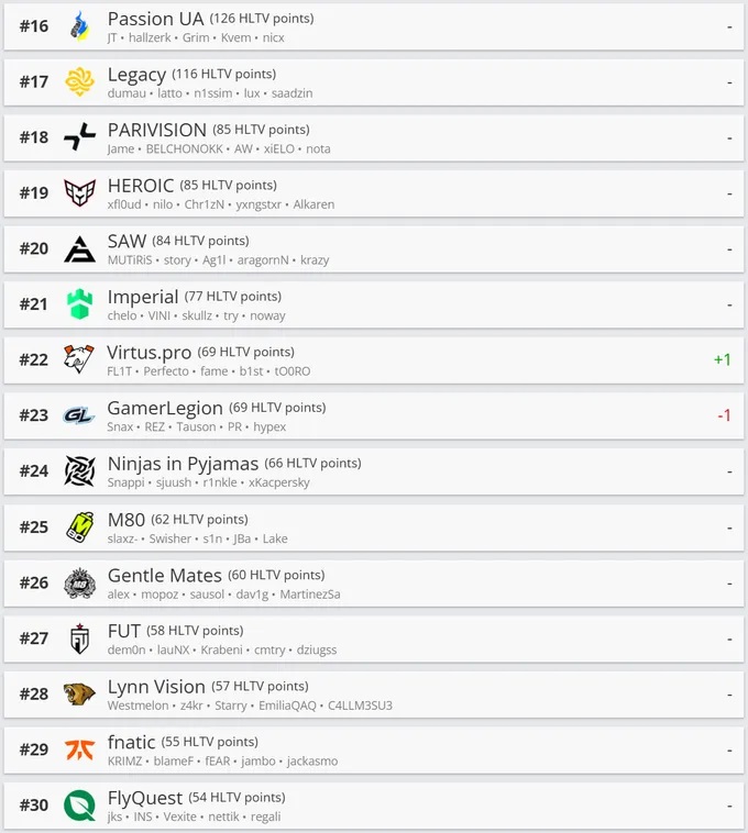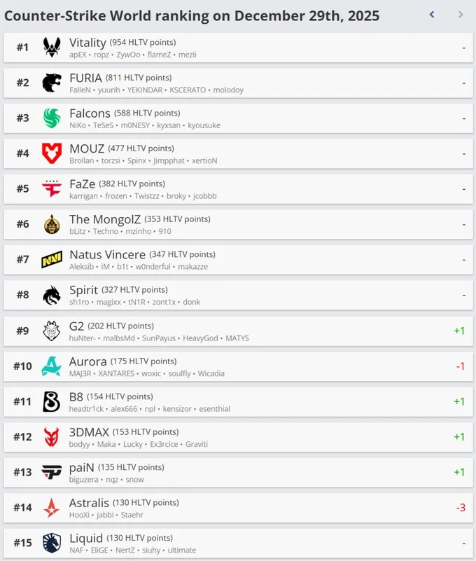 Цахим спортын HLTV сайтаас энэ сарын 29-нд CS2 төрлийн 2025 оны сүүлийн чансаагаа толилууллаа. “Team Vitality” баг чансааг тэргүүлж, эхний найман багийн дараалал өөрчлөгдсөнгүй.