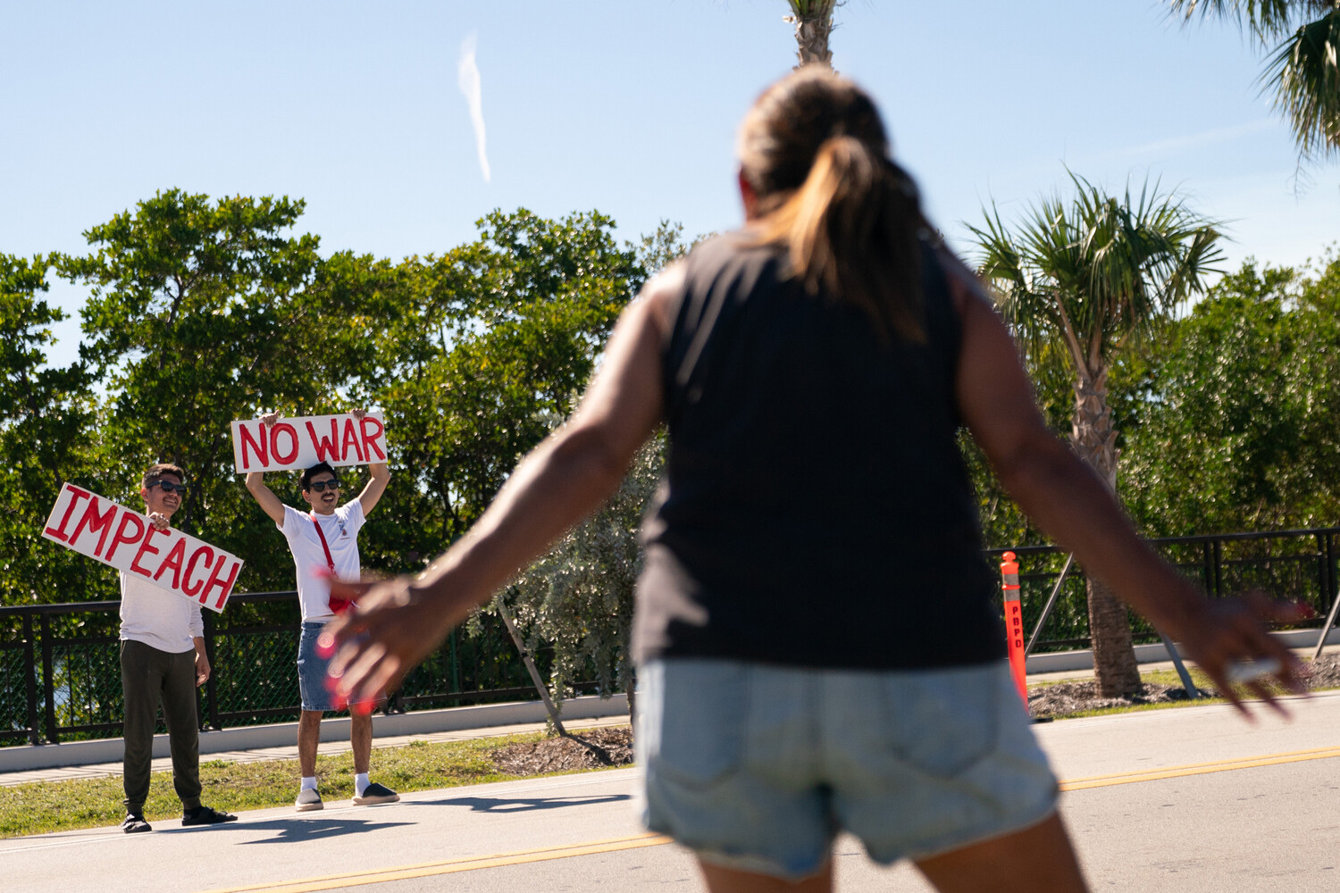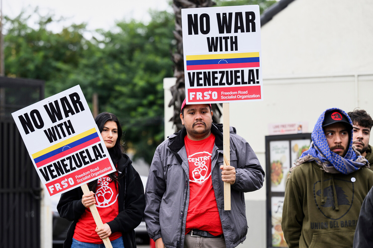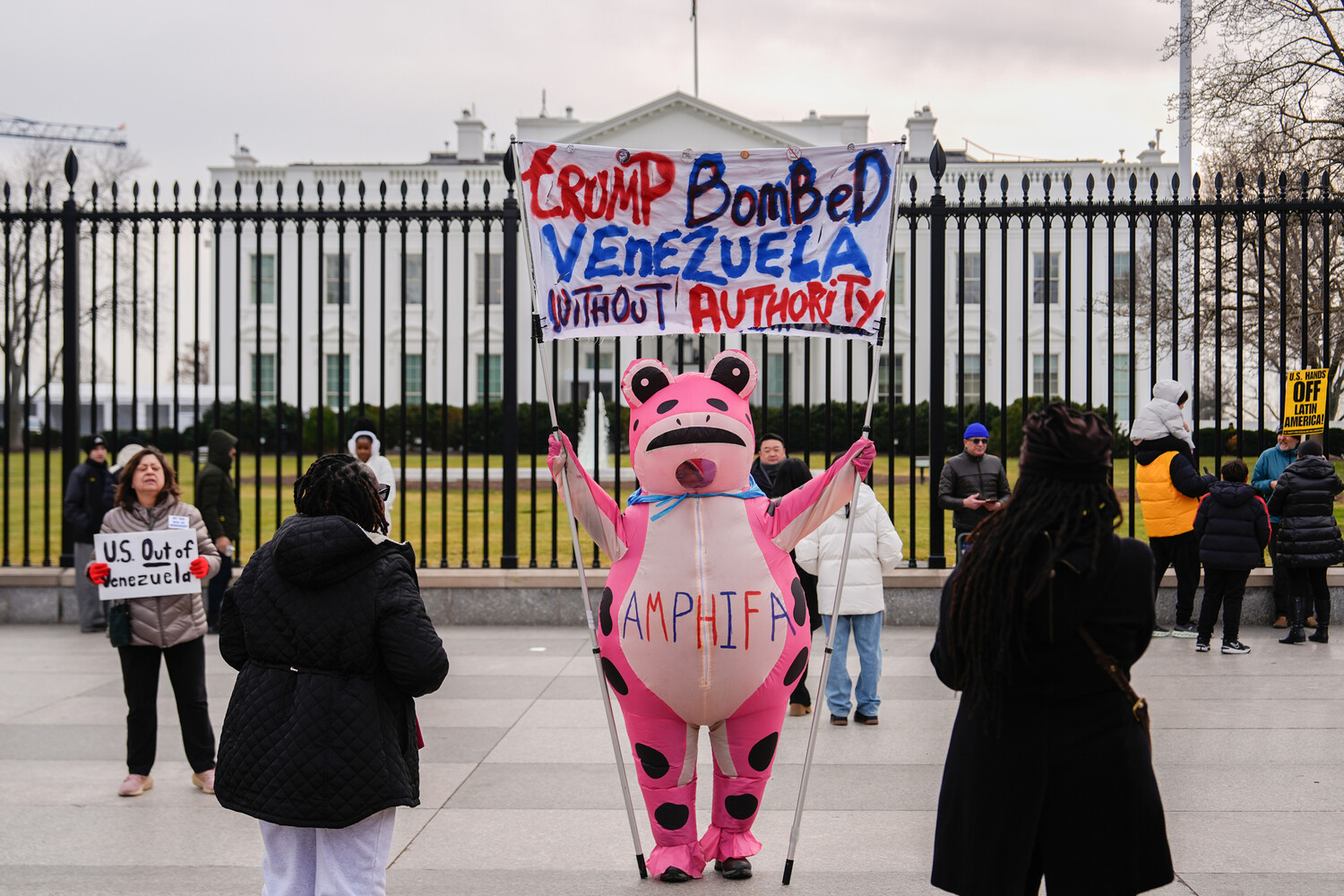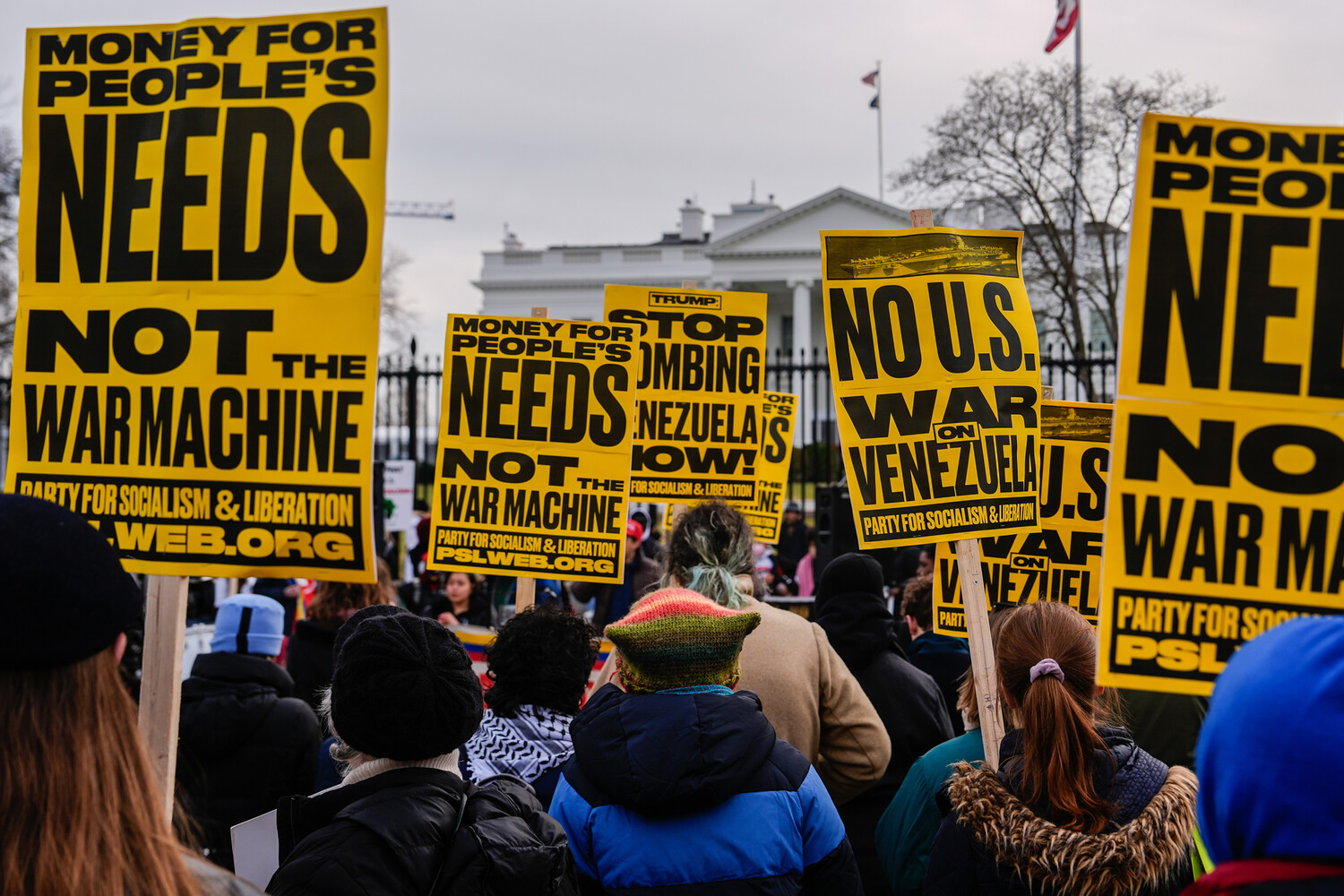 Цагаан ордны дэргээд жагсагчид “Дайн хэрэггүй”, “Нефтийн төлөө цус урсгахгүй”, “Латин Америкаас савраа тат” зэрэг уриа лоозон барьсан байв.
