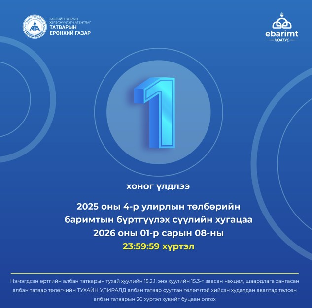 2025 оны 4-р улирлын төлбөрийн баримтаа өнөөдөр буюу нэгдүгээр сарын 08-ны 23:59:59 цагаас өмнө амжиж бүртгүүлэн НӨАТ-ын буцаан олголтын урамшууллаа авна уу гэж Татварын ерөнхий газраас мэдээллээ.
