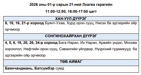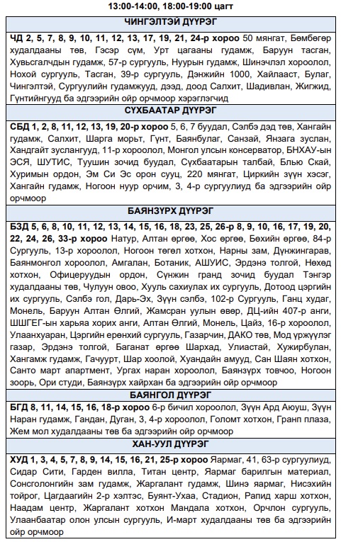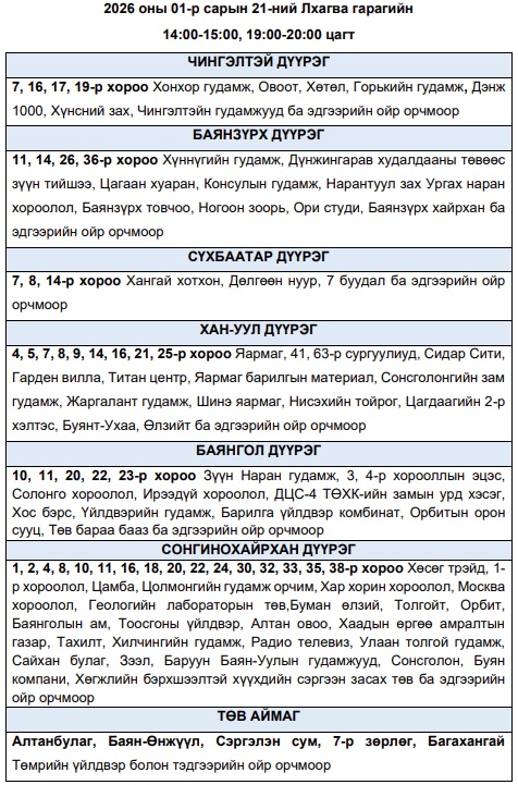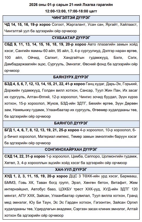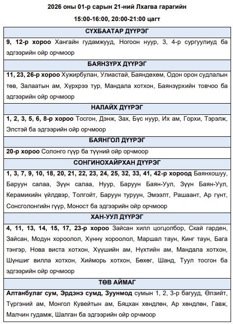Эрчим хүчний чадлын дутагдлаас шалтгаалан 2026 оны нэгдүгээр сарын 21-ний лхагва гарагт цахилгаан эрчим хүчний “хязгаарлалт хийж болзошгүй” байршлуудын хуваарийг Улаанбаатар цахилгаан түгээх станцаас мэдээллээ. Тус газраас “Эрчим хүчний системийн тасралтгүй, найдвартай байдлыг хангахын тулд дараах цагуудад зайлшгүй шаардлагатай бус цахилгаан хэрэгслүүдээ унтрааж, тогоо тохируулахыг иргэд, аж ахуйн нэгжүүдэд уриалж байна. Эрчим хүчний системд аваарын горим үүсэхээс сэргийлэн нийслэлийн хэмжээнд тодорхой байршлуудад цахилгаан эрчим хүчний төлөвлөсөн хэрэглээг “Диспетчерийн үндэсний төв” ТӨХХК-ийн шийдвэрээр хуваарийн дагуу 1-ээс 1 цаг 30 минутын хугацаатайгаар хязгаарлах арга хэмжээ авч байна. Эрчим хүчний эх үүсвэрт үүссэн техникийн гэмтэл, хүндрэлийг сэргээхээр хүндрүүлсэн нөхцөлд ажиллаж буй эрчим хүчний салбарын инженер техникийн ажилтнууд болон салбарын нөхцөл байдлыг бодитоор хүлээн авч ойлгон, тогоо тохируулж буй хүн бүрд талархал илэрхийлье” гэжээ.