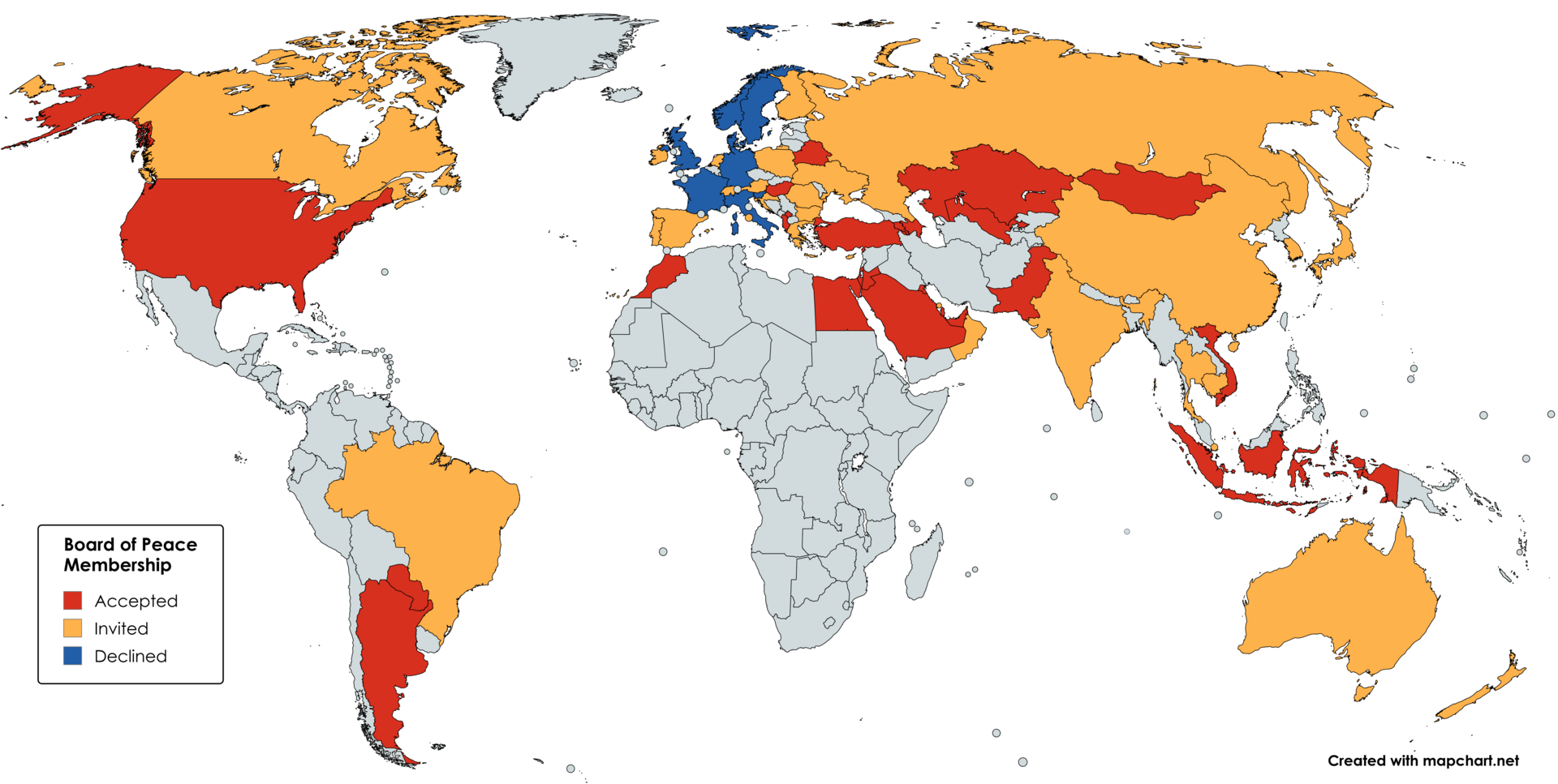 Өнөөдрийн байдлаар Трампын “Энхийн зөвлөл”-д дэлхийн 19 орон нэгдээд байна. Урилга хүргүүлсэн орнууд дараах байдлаар хариу үзүүлжээ. Нийт 50 гаруй улсыг гишүүнээр урьснаас 20 гаруй нь хүлээж авчээ.