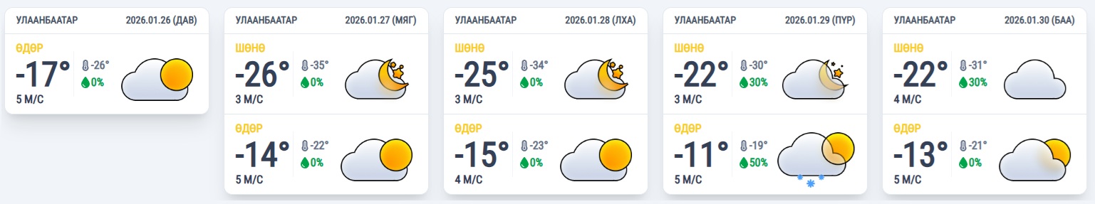 Өнөөдөр Улаанбаатарт багавтар үүлтэй. Цас орохгүй. Салхи баруун хойноос секундэд 3-8 метр. Өдөртөө 16-18 градус хүйтэн байна.