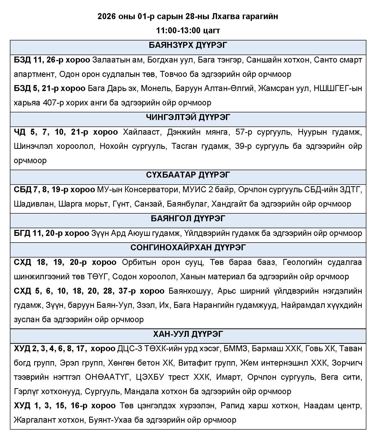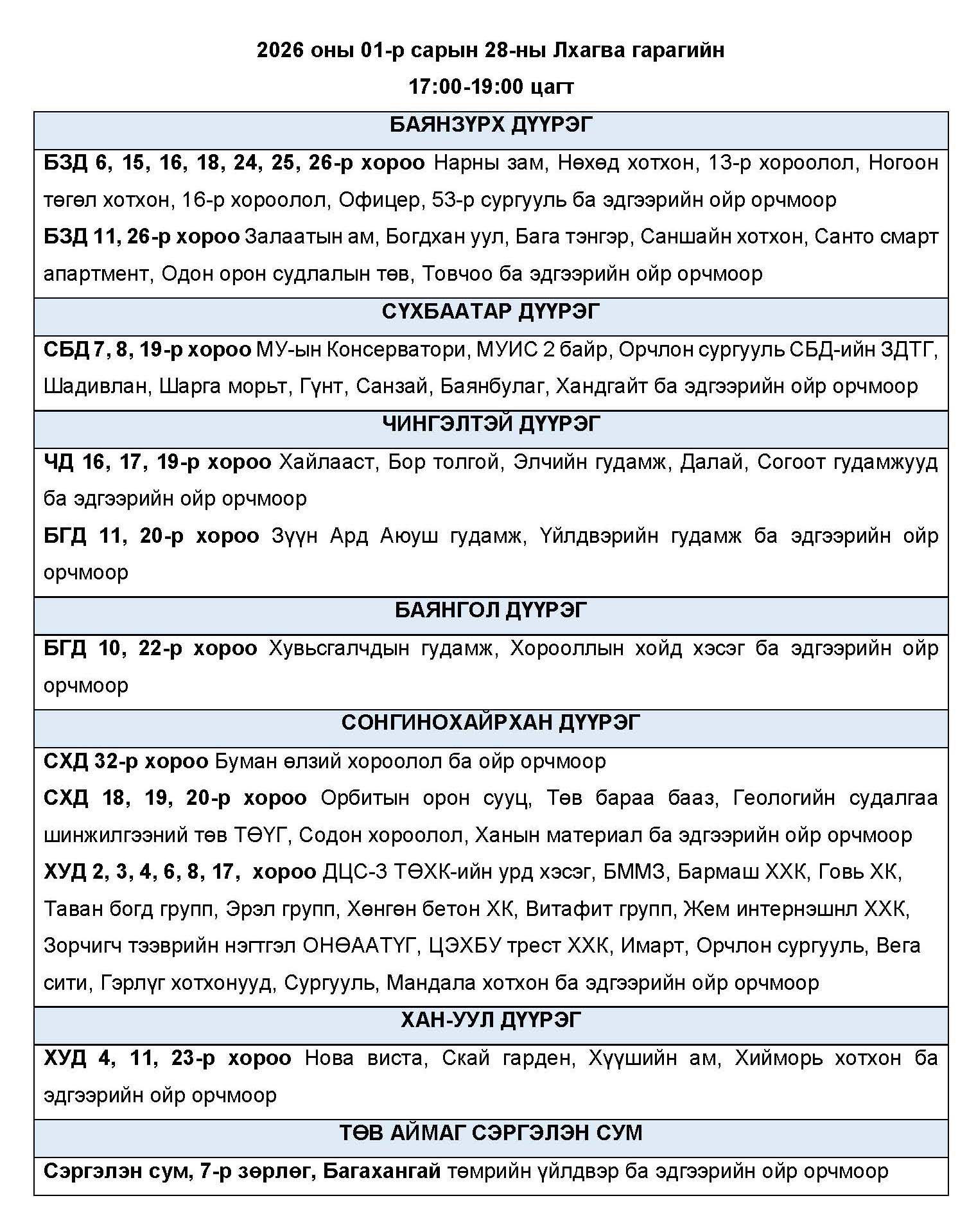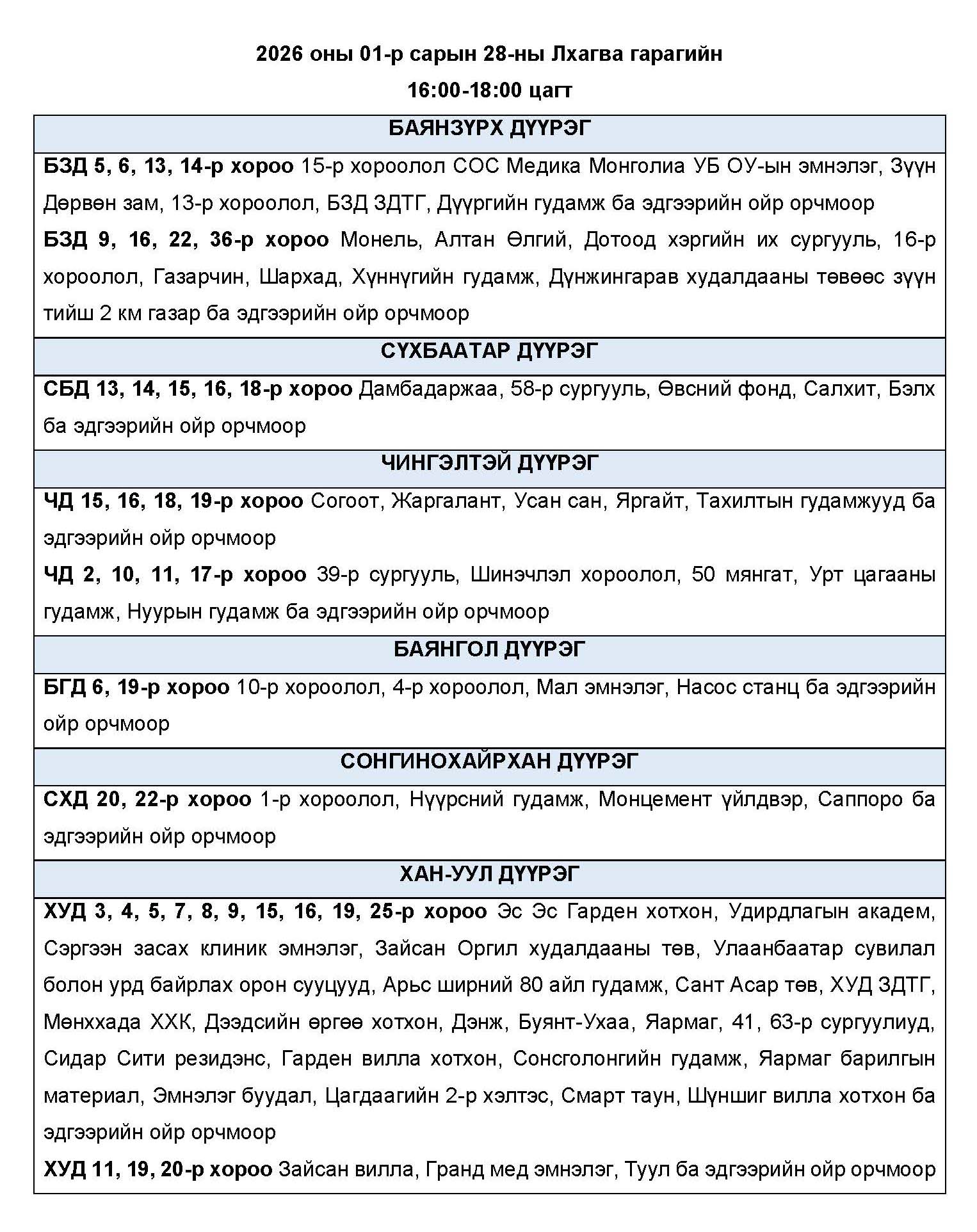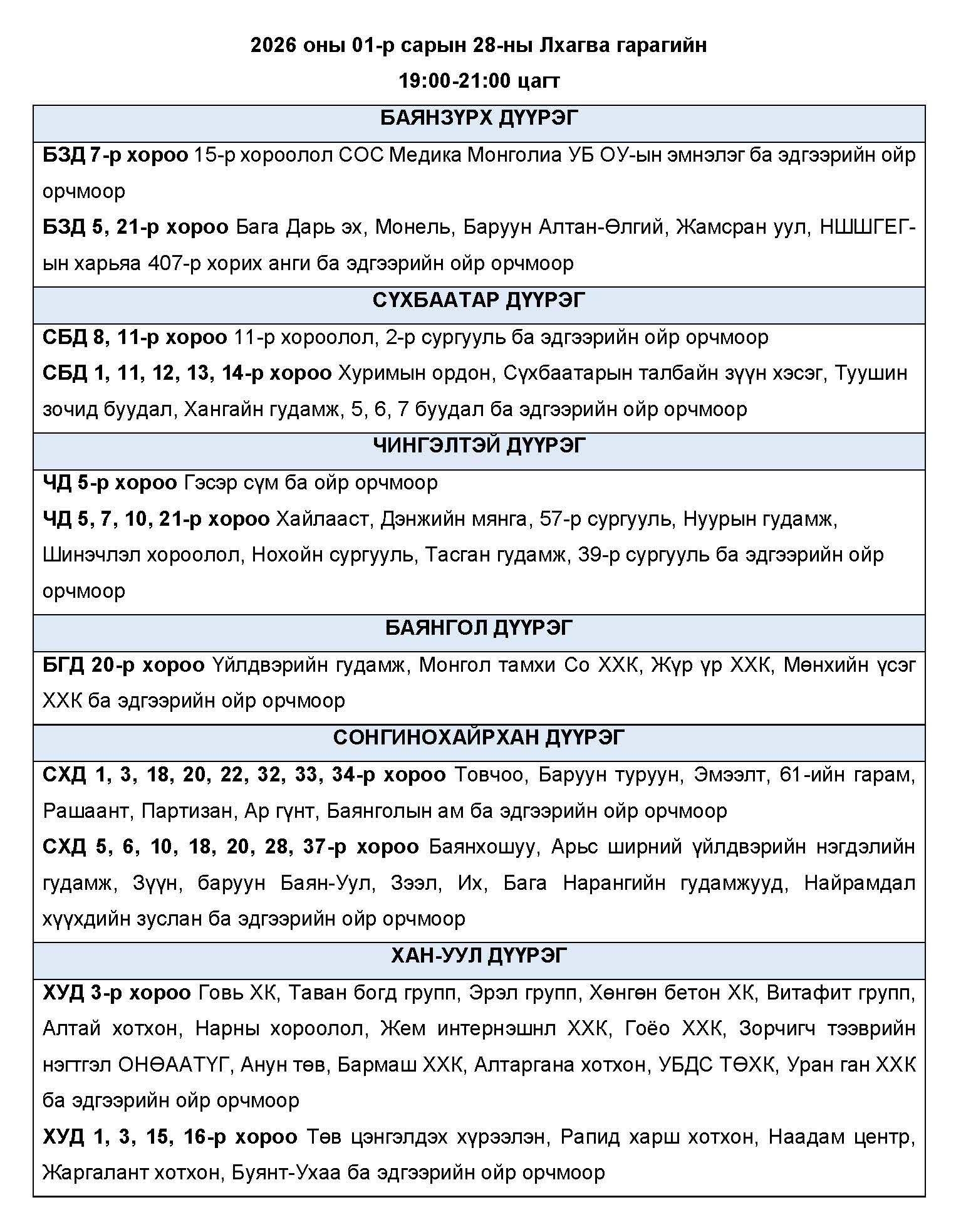 Өнөөдөр буюу 2026 оны нэгдүгээр сарын 28-ны лхагва гарагт цахилгаан эрчим хүчний “ХЯЗГААРЛАЛТ ХИЙХ” байршлуудын хуваарийг танилцуулж байна.
