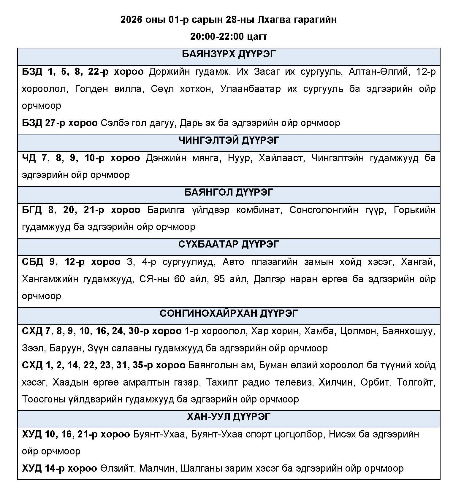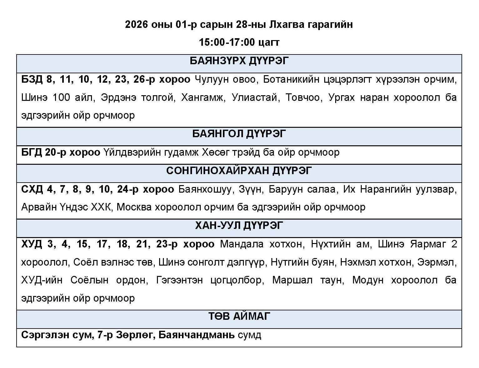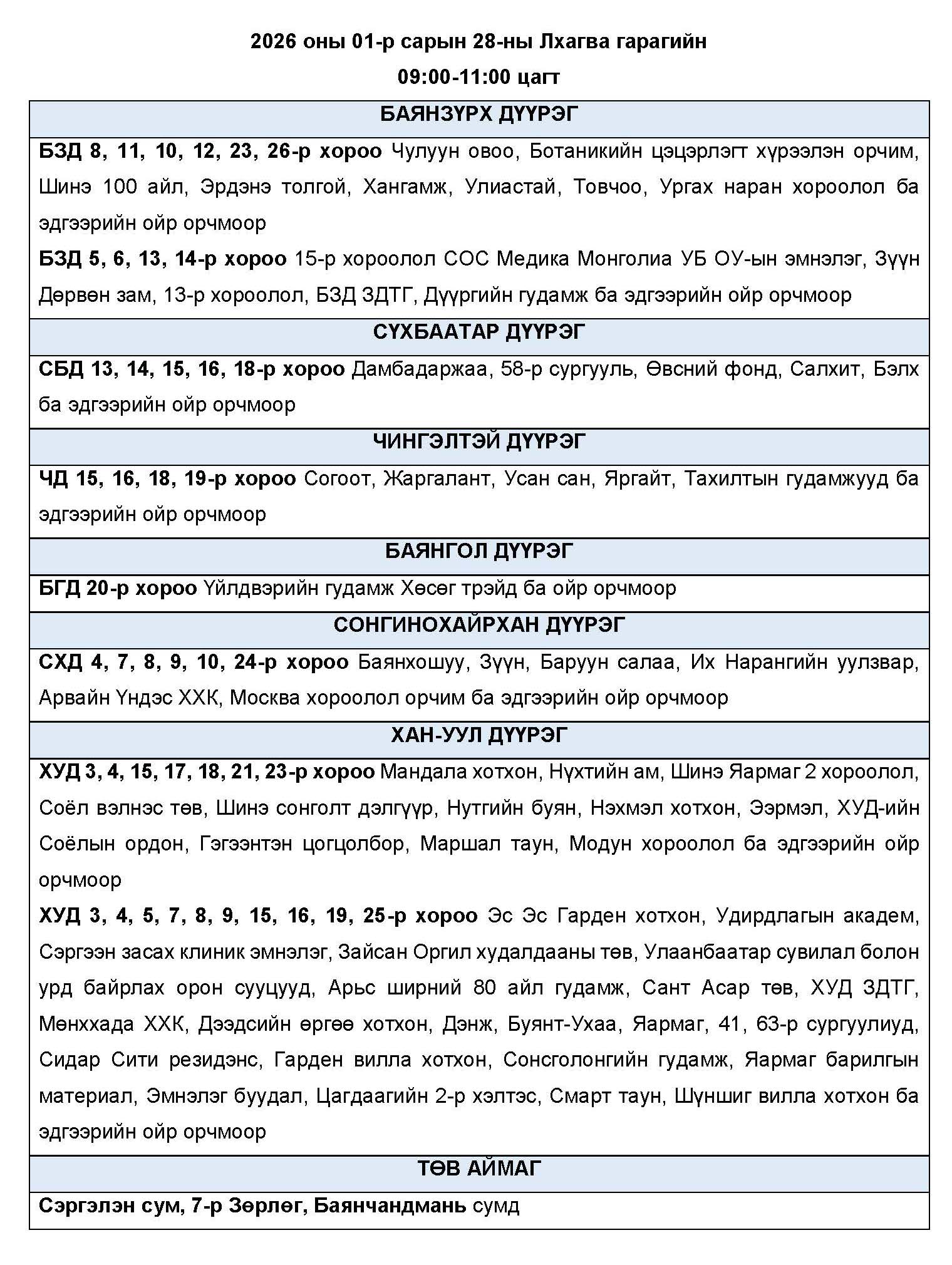 Өнөөдөр буюу 2026 оны нэгдүгээр сарын 28-ны лхагва гарагт цахилгаан эрчим хүчний “ХЯЗГААРЛАЛТ ХИЙХ” байршлуудын хуваарийг танилцуулж байна.