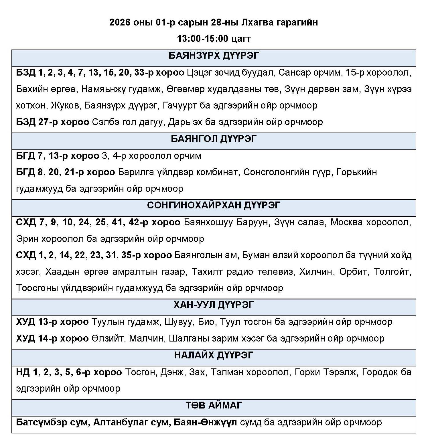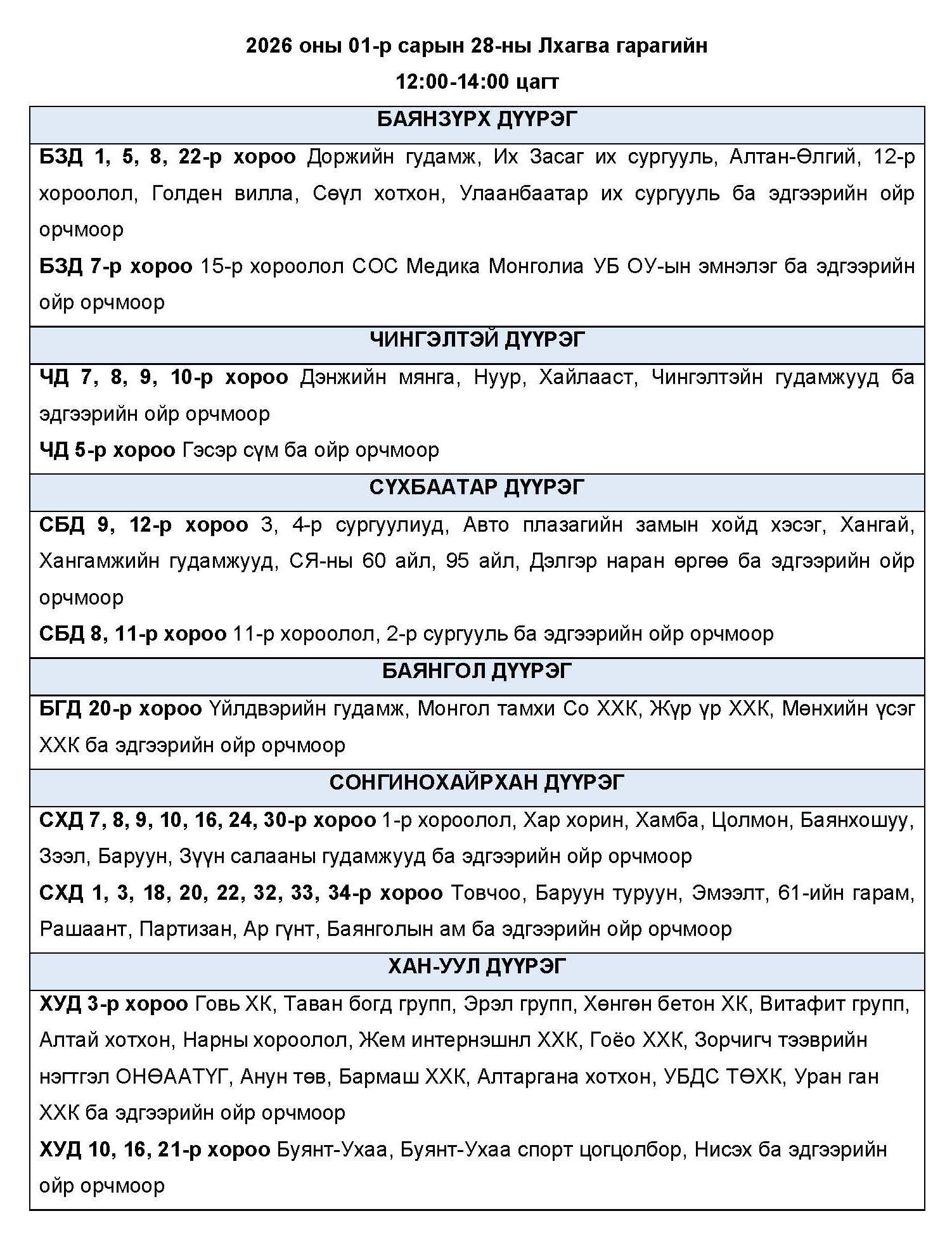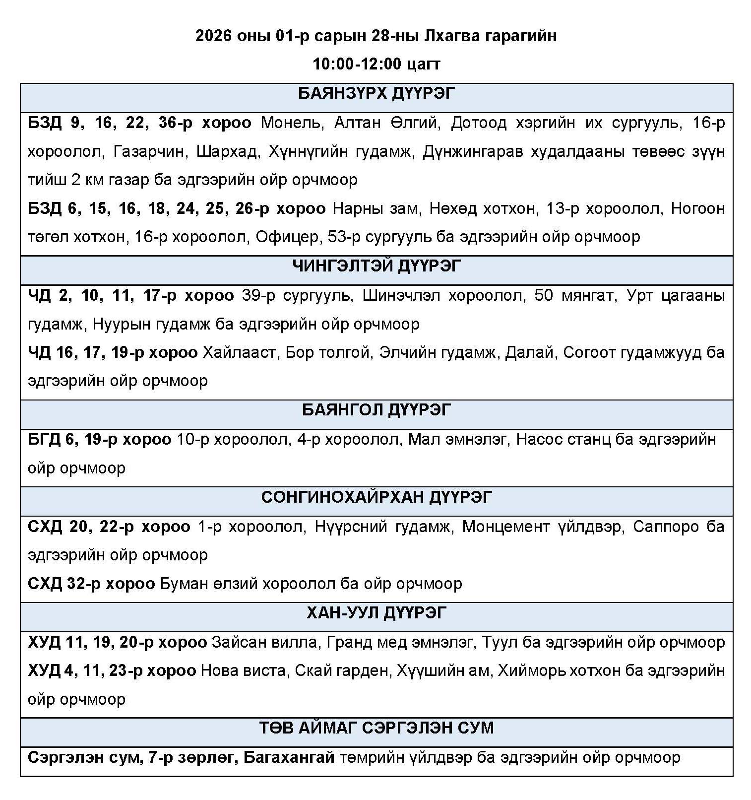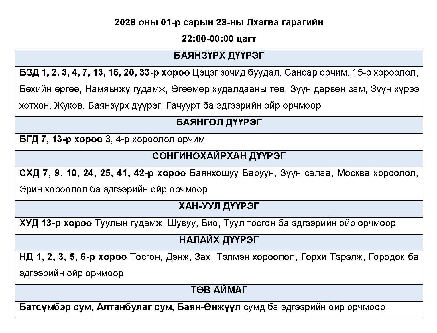 Өнөөдөр буюу 2026 оны нэгдүгээр сарын 28-ны лхагва гарагт цахилгаан эрчим хүчний “ХЯЗГААРЛАЛТ ХИЙХ” байршлуудын хуваарийг танилцуулж байна.