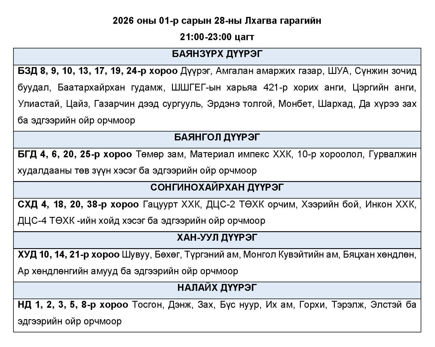 Эрчим хүчний нэгдсэн сүлжээнд аваарын горим үүсэхээс сэргийлэн тодорхой байршлуудад цахилгаан эрчим хүчний төлөвлөсөн хэрэглээг “Диспетчерийн үндэсний төв” ТӨХХК-ийн шийдвэрээр хуваарийн дагуу 2 цагийн хугацаатайгаар хязгаарлах арга хэмжээ авч байна.