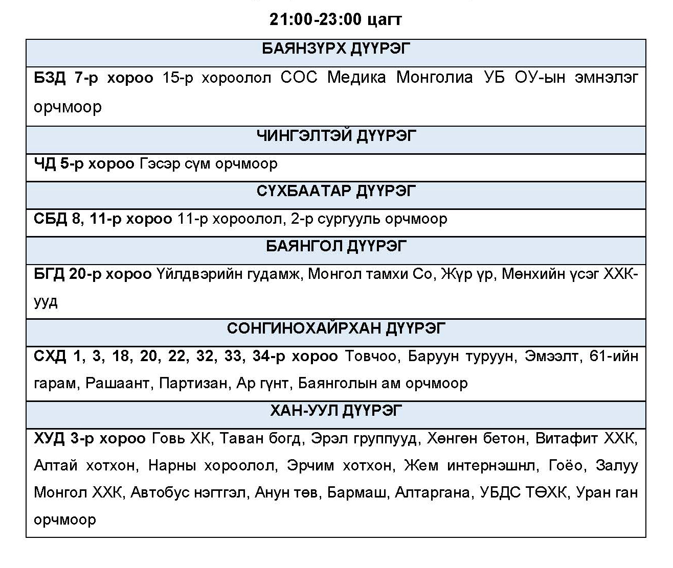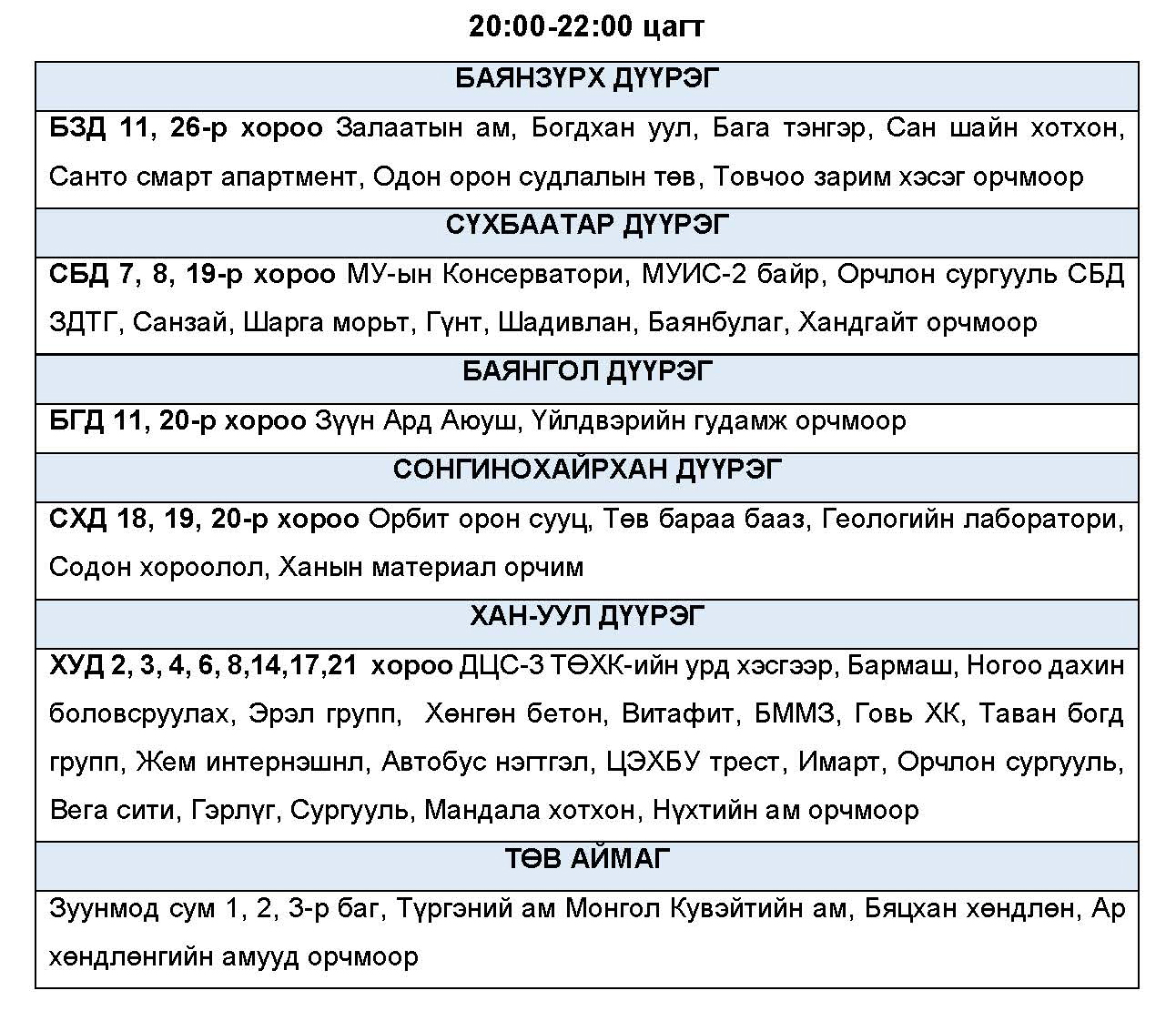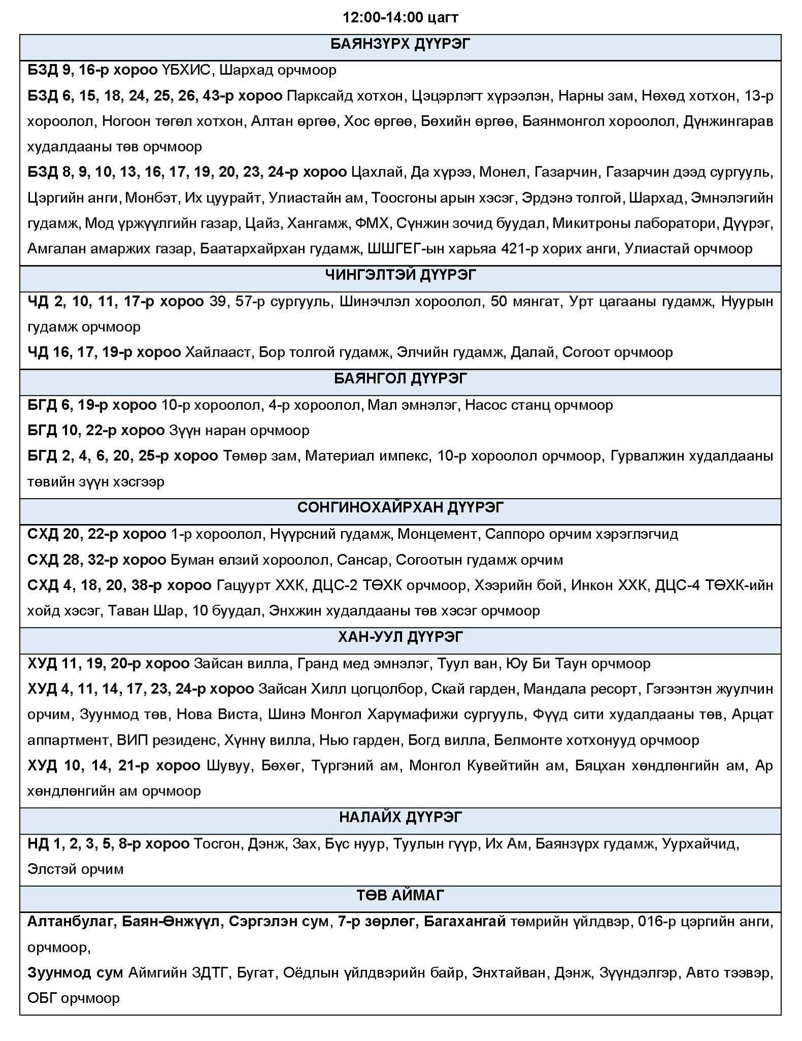 Эрчим хүчний нэгдсэн сүлжээнд аваарын горим үүсэхээс сэргийлэн тодорхой байршлуудад цахилгаан эрчим хүчний төлөвлөсөн хэрэглээг “Диспетчерийн үндэсний төв” ТӨХХК-ийн шийдвэрээр хуваарийн дагуу 2 цагийн хугацаатайгаар хязгаарлах арга хэмжээ авч байна.
