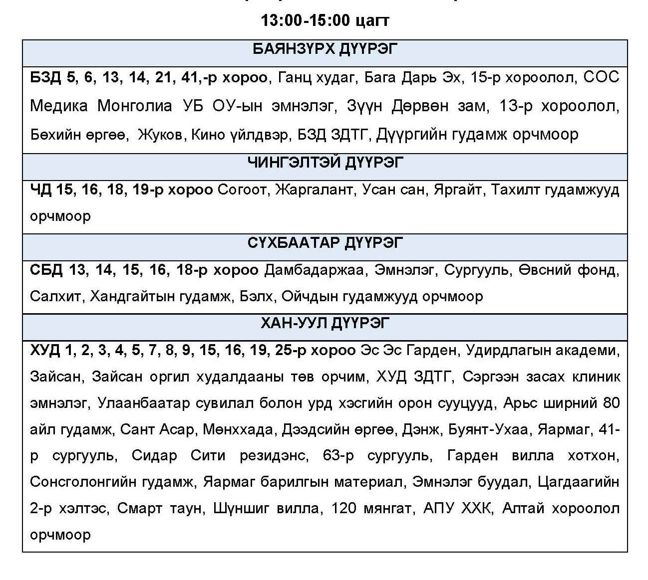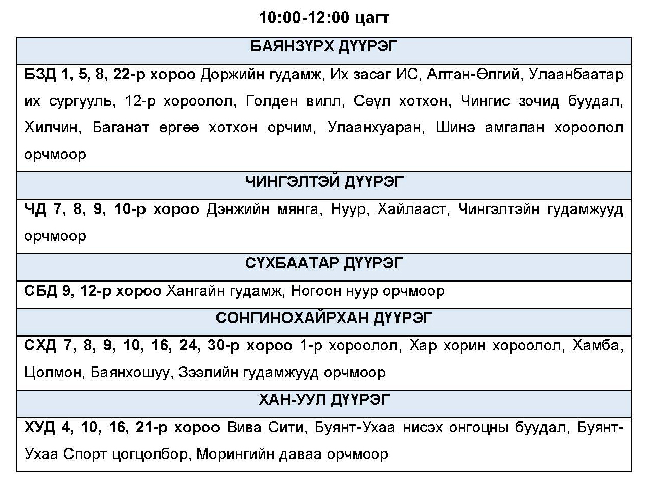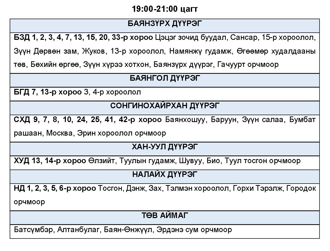 Эрчим хүчний нэгдсэн сүлжээнд аваарын горим үүсэхээс сэргийлэн тодорхой байршлуудад цахилгаан эрчим хүчний төлөвлөсөн хэрэглээг “Диспетчерийн үндэсний төв” ТӨХХК-ийн шийдвэрээр хуваарийн дагуу 2 цагийн хугацаатайгаар хязгаарлах арга хэмжээ авч байна.