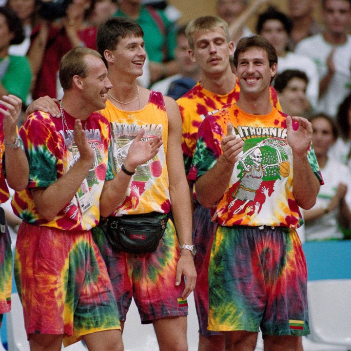 1992 оны Барселонагийн олимпод Литва улсын тамирчид анхаарал татсан. Хоёрхон жилийн өмнө тусгаар тогтнолоо олсон энэ улс анх удаагаа бие даан олимпод оролцож байв. Хөрөнгө мөнгөгүй ядуу оронд тамирчдаа хувцаслах санхүү байсангүй. Энэ үед тэдэнд туслахаар Японы авангард-дизайнер Иссэй Миякэ, АНУ-ын Grateful Dead рок хамтлаг ирсэн юм. Литвагийн багийн эмч Миякэд захидал бичсэнээр энэ түүх эхэлсэн. Миякэ үнэ төлбөргүй нээлтийн ёслолын хувцасны загварыг гаргаж өгсөн бол Grateful Dead хамтлаг санхүүгийн тусламжаас гадна сагсан бөмбөгийн багт нь хурц өнгийн өмсгөл илгээж байлаа. Сагсан бөмбөгчид хүрэл медаль авсны дараа өмсгөл нь 200 мянган хувь зарагдсаны орлогыг Литвагийн спортын хөгжилд зарцуулсан байна.
