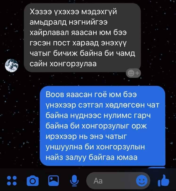Жишээ нь та гоё зурдаг бол зургийг нь зураад шууд л чатаар илгээгээрэй. Эсвэл дуу дуулж чаддаг, хөгжим тоглодог бол бичлэг явуулж болох юм. Тэр хүнийхээ сэтгэлд хүрэх хамгийн нандин зүйлийг мэдрэмжээрээ дүүргэж, тэр хүндээ илгээгээрэй. Зөвхөн чат бичилцсээр байгаад уулзаж, танилцаж, бүр гэрлэсэн хүмүүс байдаг юм шүү. Бүх зүйл таны энерги, үгийн сонголт, мэдрэмжээс л хамаарах болно. Амжилт хүсье.
