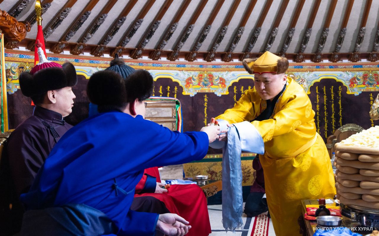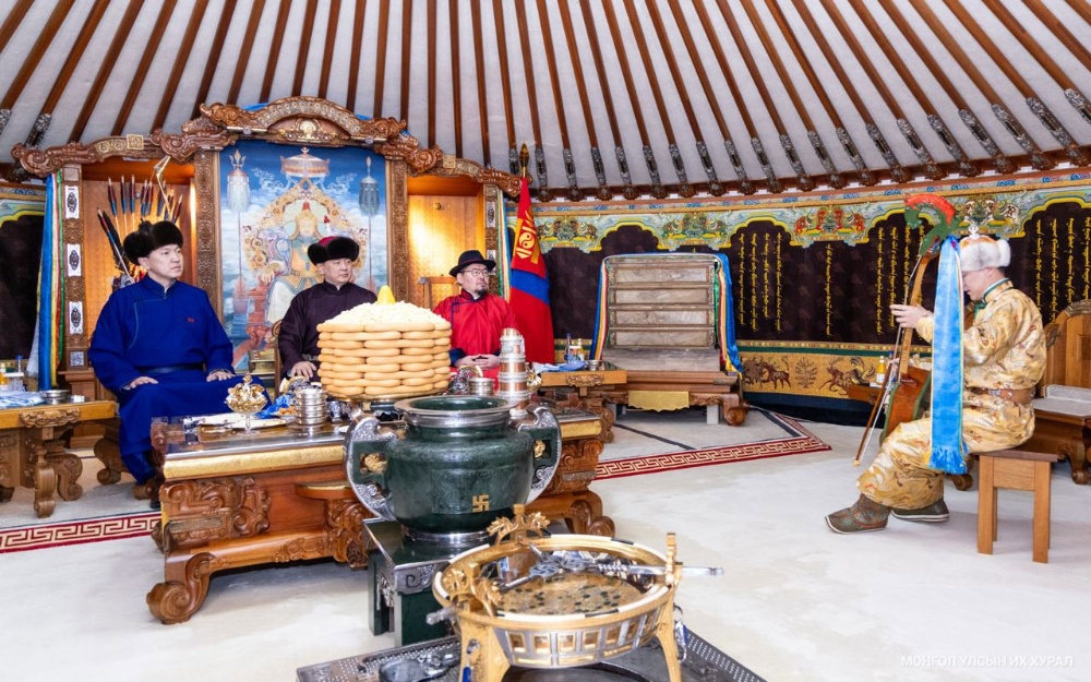 "Сүрээр дарагч" хэмээх гал улаан морин жилийн хаврын тэргүүн сарын шинийн нэгний өглөө (2026.02.18) Монгол төрийн золголт Төрийн ёслол хүндэтгэлийн өргөөнд 08.30 цагт ёслол төгөлдөр боллоо.