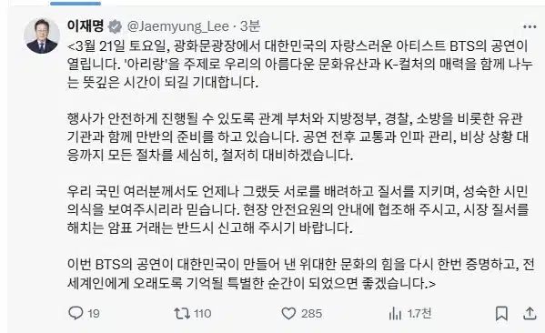 Тэрээр “Энэ сарын 21-ний Бямба гарагт манай улсын бахархал болсон BTS хамтлагийн тоглолттой. Би энэ үйл явдлыг тэсэн ядан хүлээж байна. ARIRANG сэдвээр солонгос соёлын гоо сайхныг дэлхий дахинд дамжуулах болно. Эмх замбараагүй байдал гаргалгүй, сайхан наадна гэж найдаж байна” гэжээ.