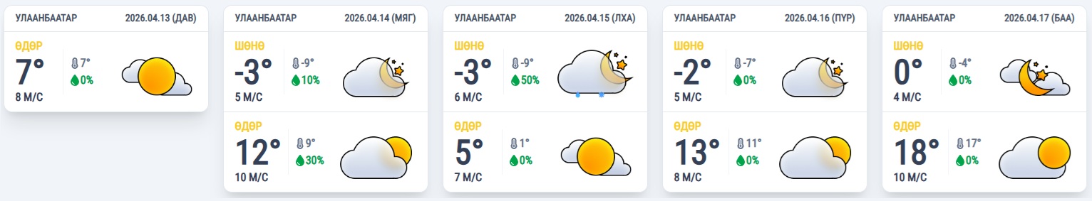Өнөөдөр Улаанбаатарт үүл багасаж, хур тунадас орохгүй. Салхи баруун хойноос секундэд 5-10 метр. Өдөртөө 6-8 градус дулаан байна.