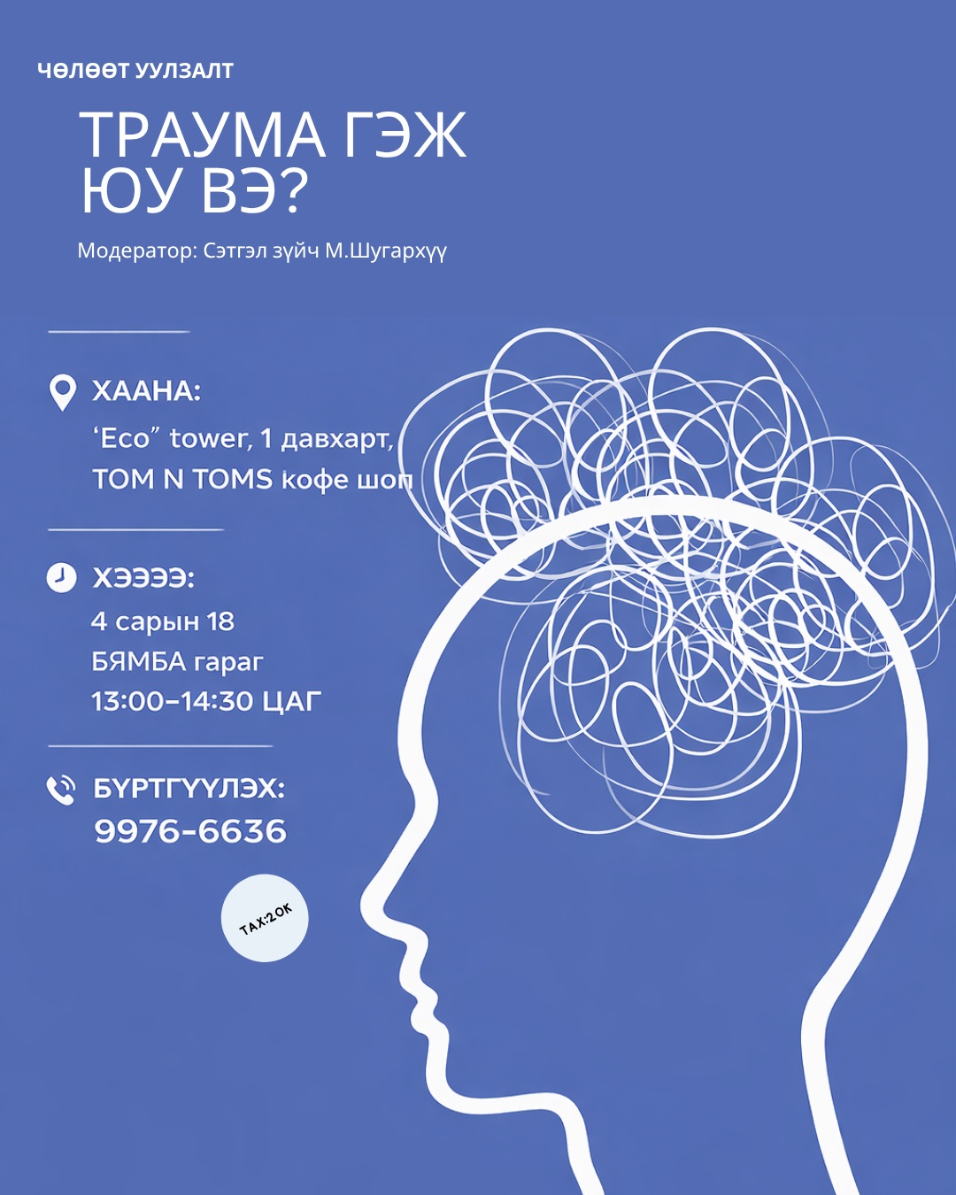 20 дах уулзалт маань "Траума гэж юу вэ?" сэдвээр явагдана. Энэхүү уулзалтаар: