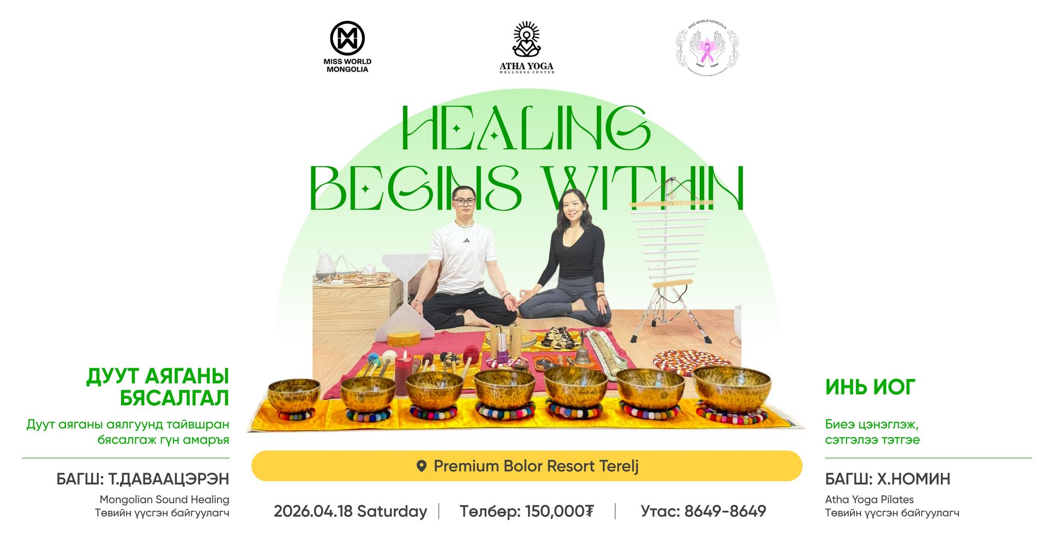 Тэрэлжийн байгалын сайханд, цэвэр агаарт гарангаа биеийнхээ чилээг гаргах Зөөлөн урсгал, тайвшруулах Инь иог хийж, Дуут аяганы бясалгалд гүн уусан амраарай. Атха төв нь "Miss World Mongolia" тэмцээний зүгээс санаачилж буй "Олон улсын стандарт хангасан, үйлчлүүлэгчдэд тав тухтай, Хөхний төвийн бүрэн шинэчлэл хийх" хандивын аянд нэгдэж байгаа аж.