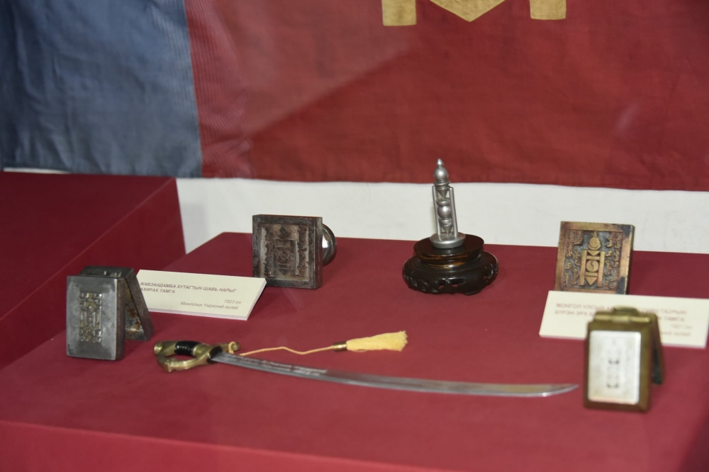 Үзэсгэлэнд Б.Амарсанаагийн цуглуулганд буй 1000 бурханы тамга, Өндөр Гэгээний шүтээн зураг, Өндөр Гэгээний өлзийт зургаан үсэг, Ерөнхий сайд Т.Намнансүрэнд зориулсан Шамбалын ерөөл хэмээх модон ном, Азарын цамын баг зэрэг ховор дурсгалд тооцогдох эд өлөг, мөн Монголын үндэсний музейн дундад зуун болон тугны сан хөмрөгт хадгалагдах эртний төрт улсуудын үеэс уламжлагдсан “Нар саран” бэлгэдэлт дүрс, Хүслийг хангагч Норов эрдэнэ, Монгол Улсын хаан Жавзандамба хутагтын ёслолын хүрэм, Богдод өргөсөн “Сүх”, Монгол улсын төрийн далбаа, Алтан соёмбот морин хуур зэрэг нийт 100 гаруй үзмэр багтжээ.