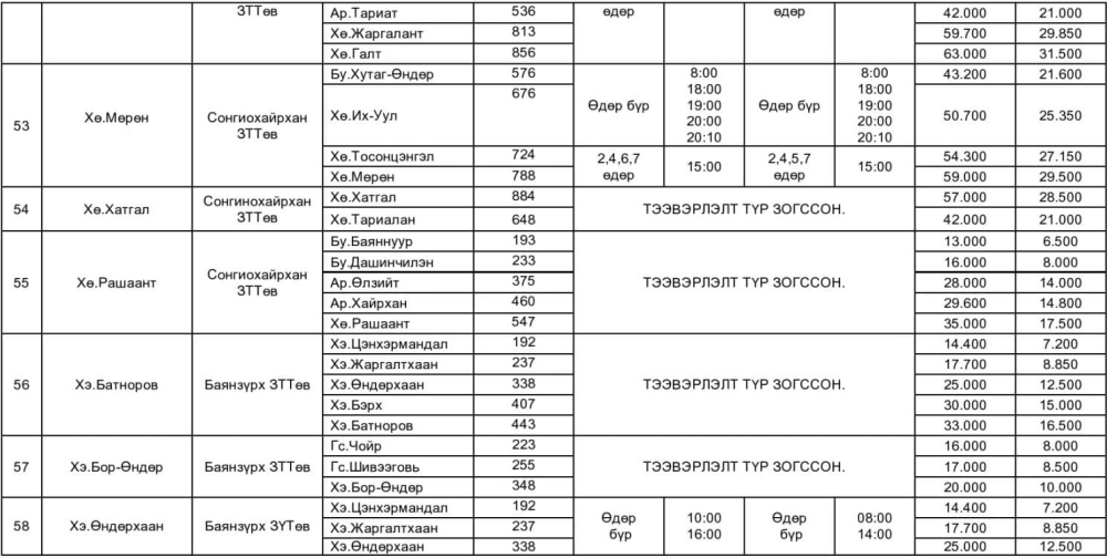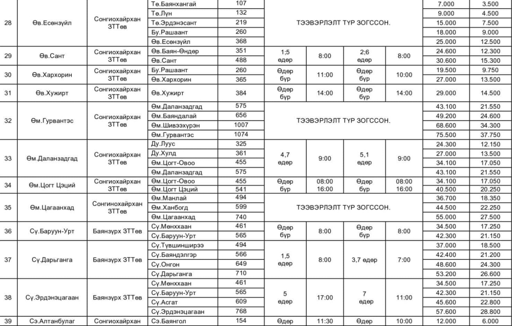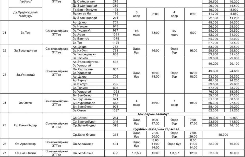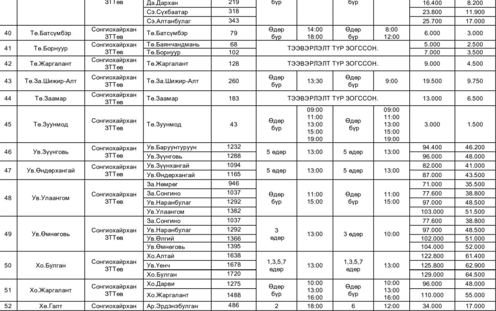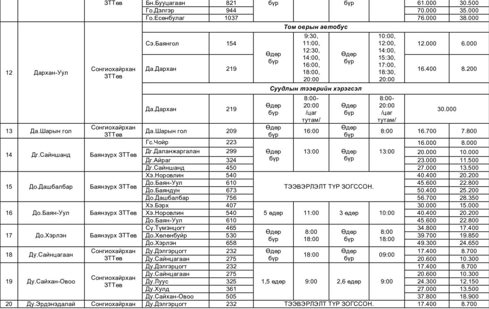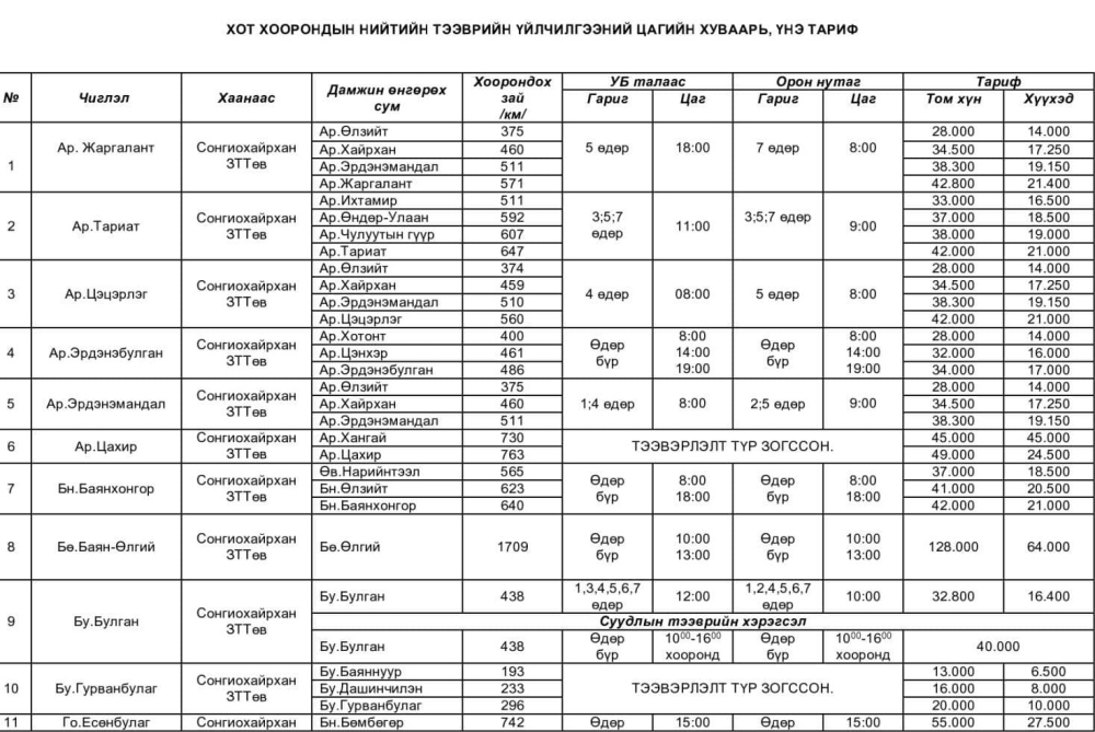 Хот хоорондын нийтийн зорчигч тээврийн үнэ тарифыг VI сарын 01-ны өдрөөс эхлэн нэмэгдүүлж байна хэмээн Автотээврийн Үндэсний төвөөс мэдэгдлээ. Тодруулбал, Зам тээврийн хөгжлийн сайдын 2019 оны 374 дугаар тушаалаар нэг хүний километр өртгийг 60-75 төгрөг байхаар тогтоосон байдаг. "Уг жишиг тарифыг тухайн үед литр түлш 2430 төгрөг байхад тогтоож байсан. Өнөөдрөөс мөрдөх үнэ тариф нь тухайн жишиг тарифын хүрээнд дээд хязгаарт хүргэж байгаа болно..." хэмээн уг мэдэгдэлд дурджээ. Ингээд хот хоорондын нийтийн тээврийн шинэчлэгдсэн үнэ тарифын мэдээллийг хүргэж байна.