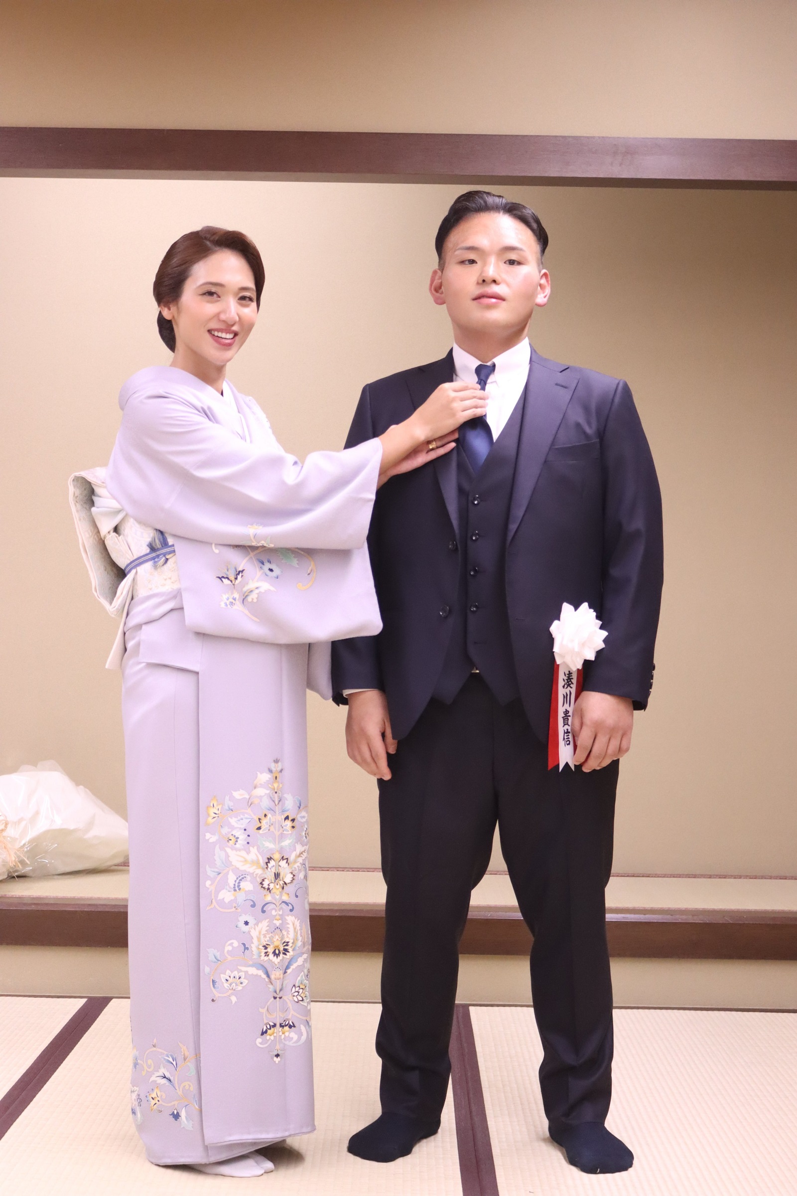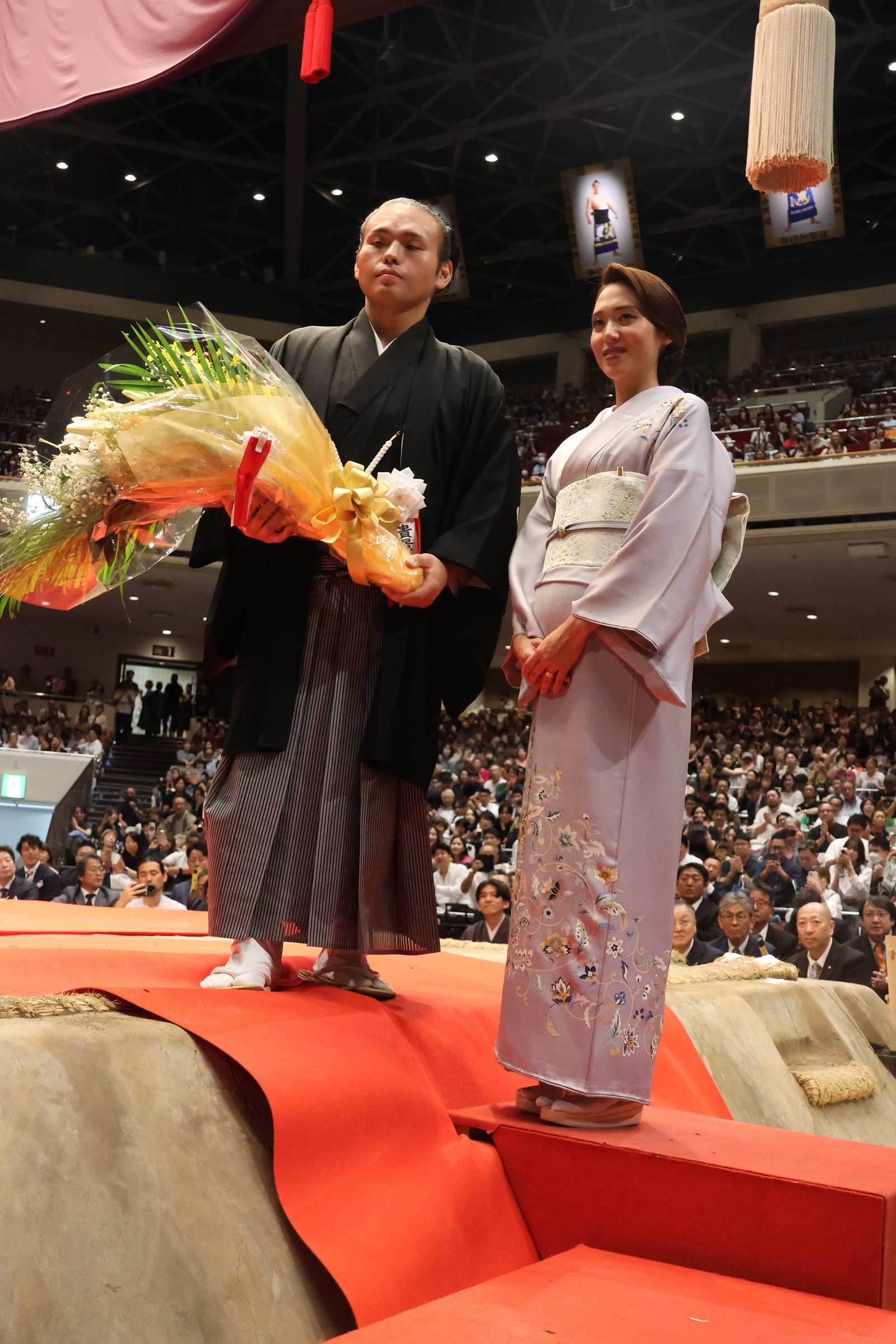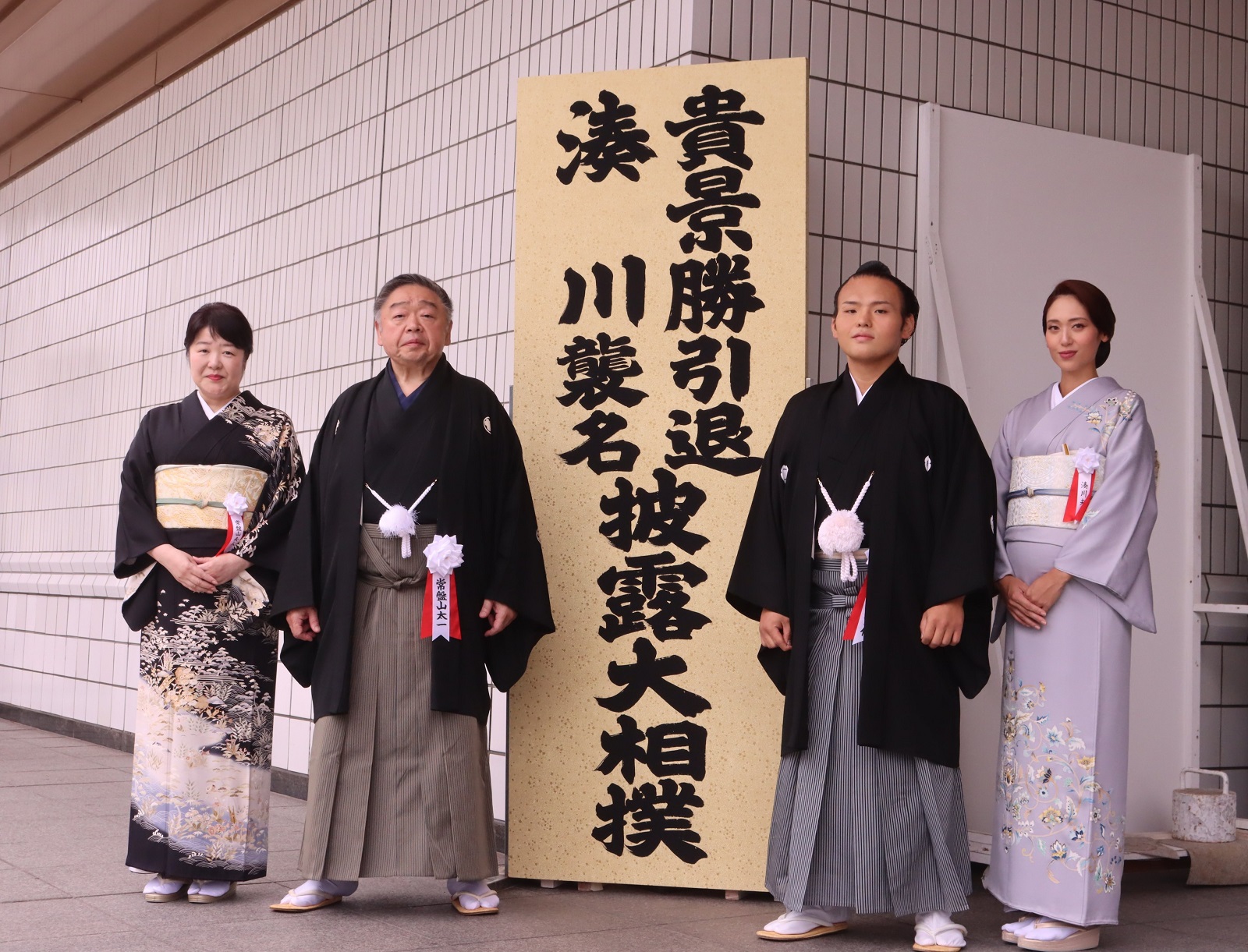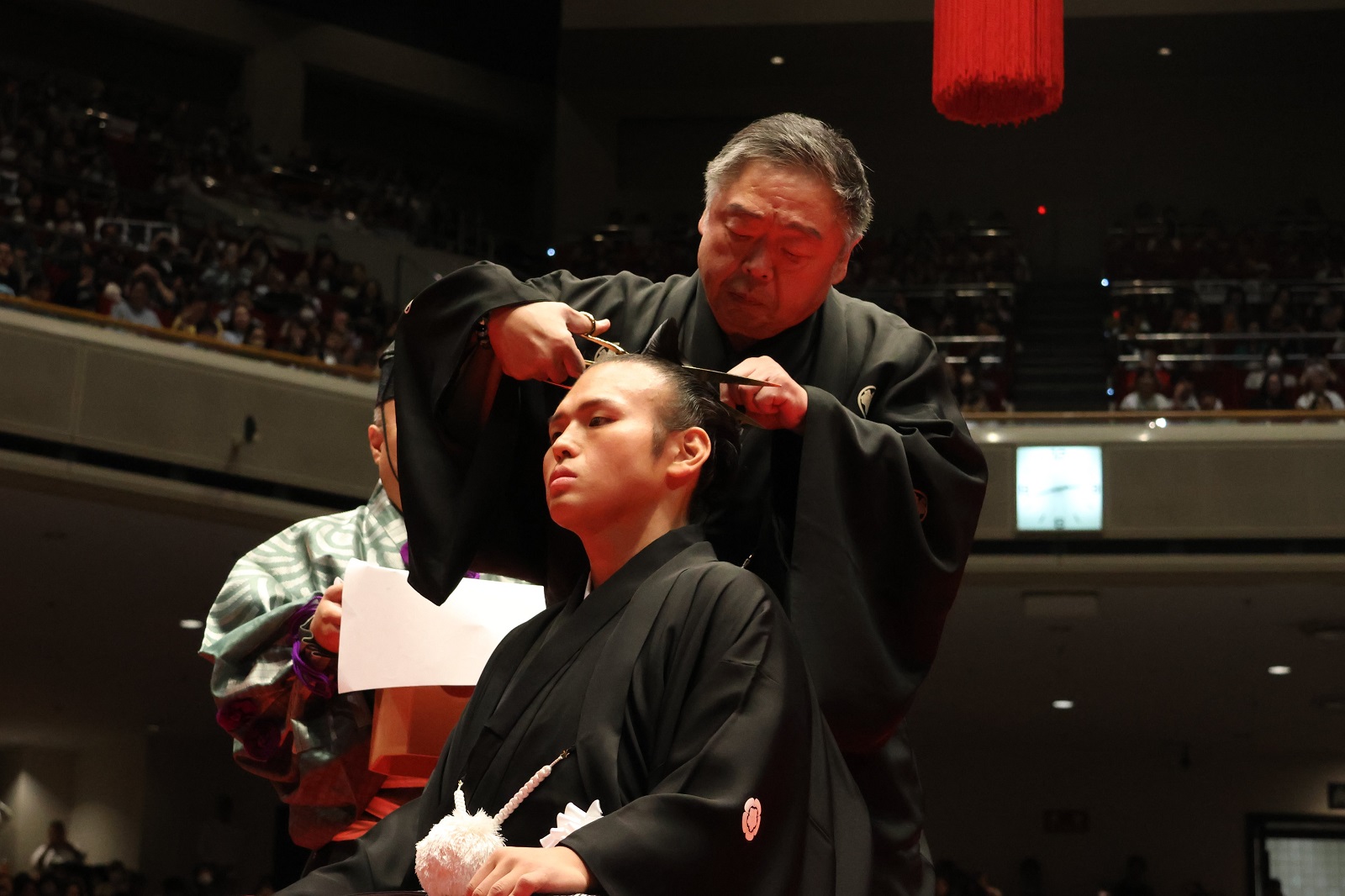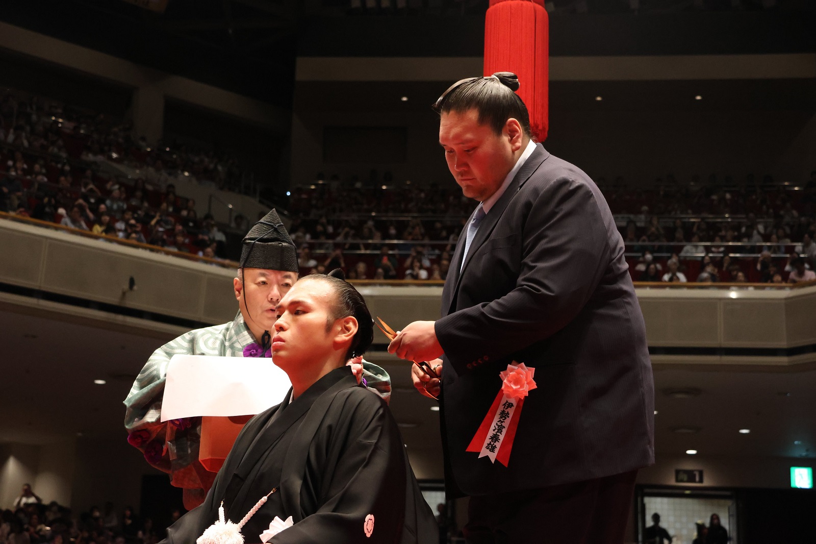 Ёкозүнагийн зөвлөлийн гишүүд, Токио хотын дарга зэрэг олон алдартан ирж, Такаккэйшёогийн үсэнд хайч хүргэлээ. Нийт 300 зочин хайч хүргэсэн ажээ. Харин түүнийг сүмод угтан авч байсан анхны багш нь болох Таканохана аварга ирсэнгүй.