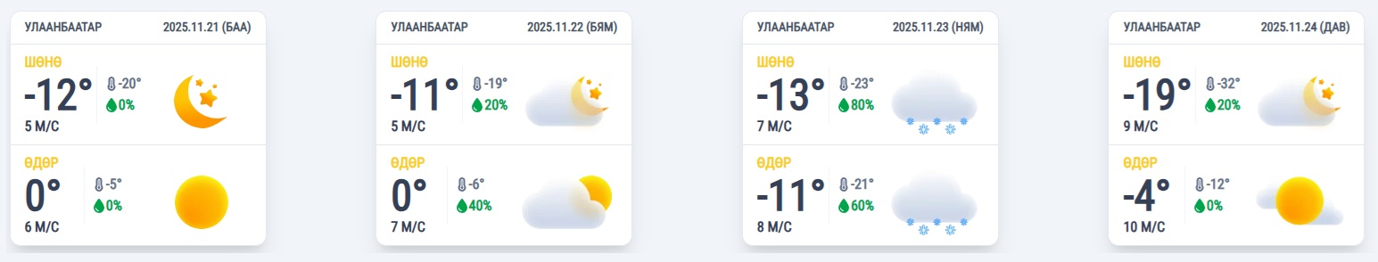 Улаанбаатарт өнөөдөр багавтар үүлтэй. Цас орохгүй. Салхи баруун хойноос секундэд 4-9 метр. Агаарын температур 17 цагт 6 градус хүйтэн байх бол 20 цагт 9 градус хүйтэн байна.