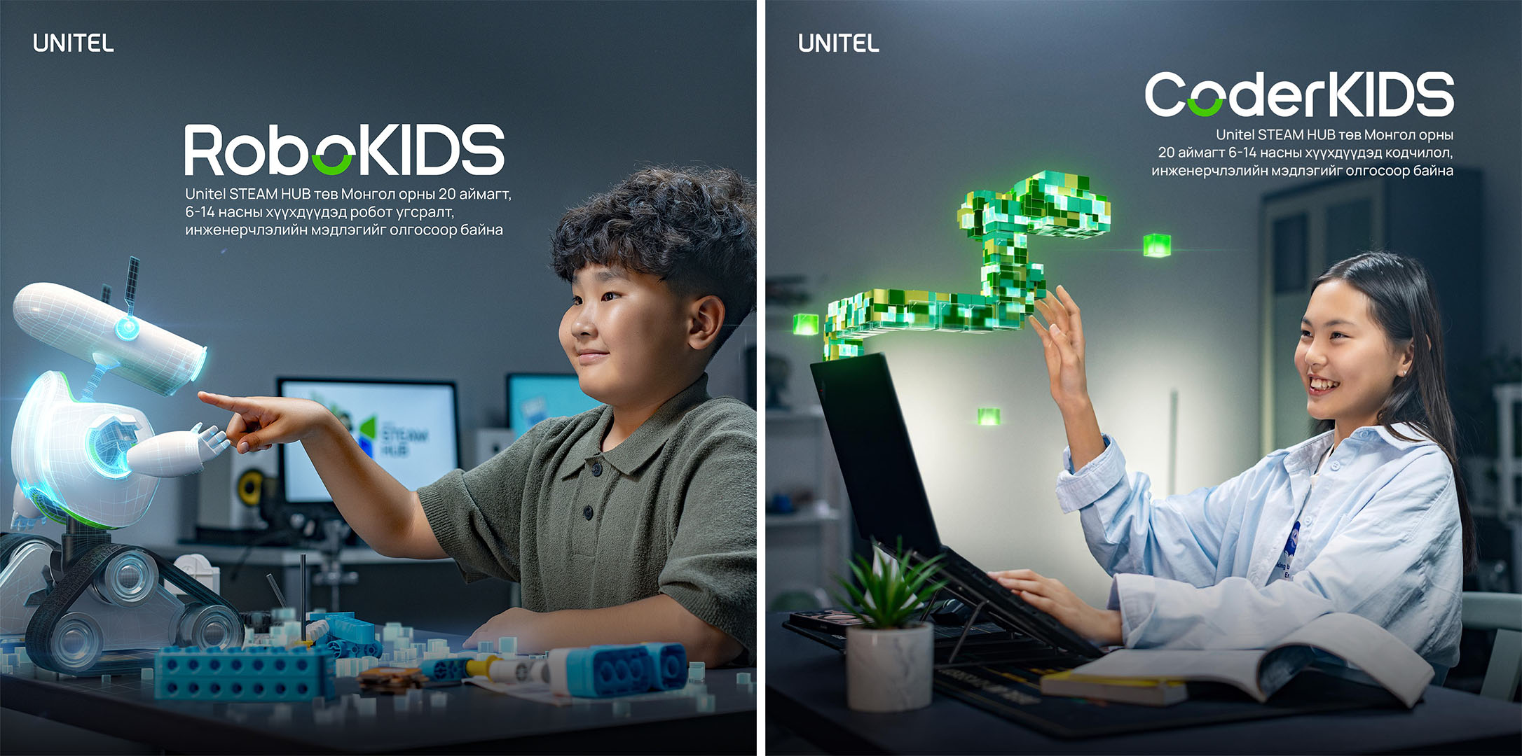 Сурагч байхдаа бид хэзээ ч орж үзээгүй ч химийн лаборатот мөрдөх дүрэм цээжилж, угсарч үзээгүй цахилгаан хэлхээгээ физикийн хичээлийн дэвтэртээ хэдэн арван удаа зурдаг байсан. Улаанбаатар хотын захын дүүргүүд, хөдөө орон нутгийн сургуулиудад практик мэдлэг олгох боломж хомс, орчин бүрдээгүйг бид бүгд мэднэ. Магадгүй тийм ч учраас өнөөдөр бидэнд инженер залуус ховор байж болох юм. Чухам энэ асуудлыг шийдэхээр Юнител групп нийгмийн хариуцлагын хүрээнд цахим заагийг бууруулах, орон даяар тэгш боловсролыг олгох зорилгоор 2022 онд Дархан-Уул аймгаас эхлэн “Unitel STEAM HUB” хөтөлбөрийг хэрэгжүүлж эхэлжээ. Энэхүү хөтөлбөр нь сурагч хүүхдүүдэд робот угсрах, код бичих зэрэг инженерчлэлийн чадварт бодитоор суралцах боломжийг олгож байна. Хөтөлбөрийн хүрээнд сургалтын орчин, эд хэрэглэгдэхүүнүүдийг хангаж, багш боловсон хүчнийг бэлтгэсээр байна. Физик, химийн хичээлээрээ үздэг байсан онолыг бодитоор практикт хэрэгжүүлэх боломжийг олгож буй тус хөтөлбөр 2025 оны байдлаар Монгол улсын 21 аймагт үйл ажиллагаа явуулж байна. Тэгвэл “Unitel STEAM HUB” хөтөлбөрийн ууган төв болох Дархан-Уул аймгийн сургалттай танилцъя.