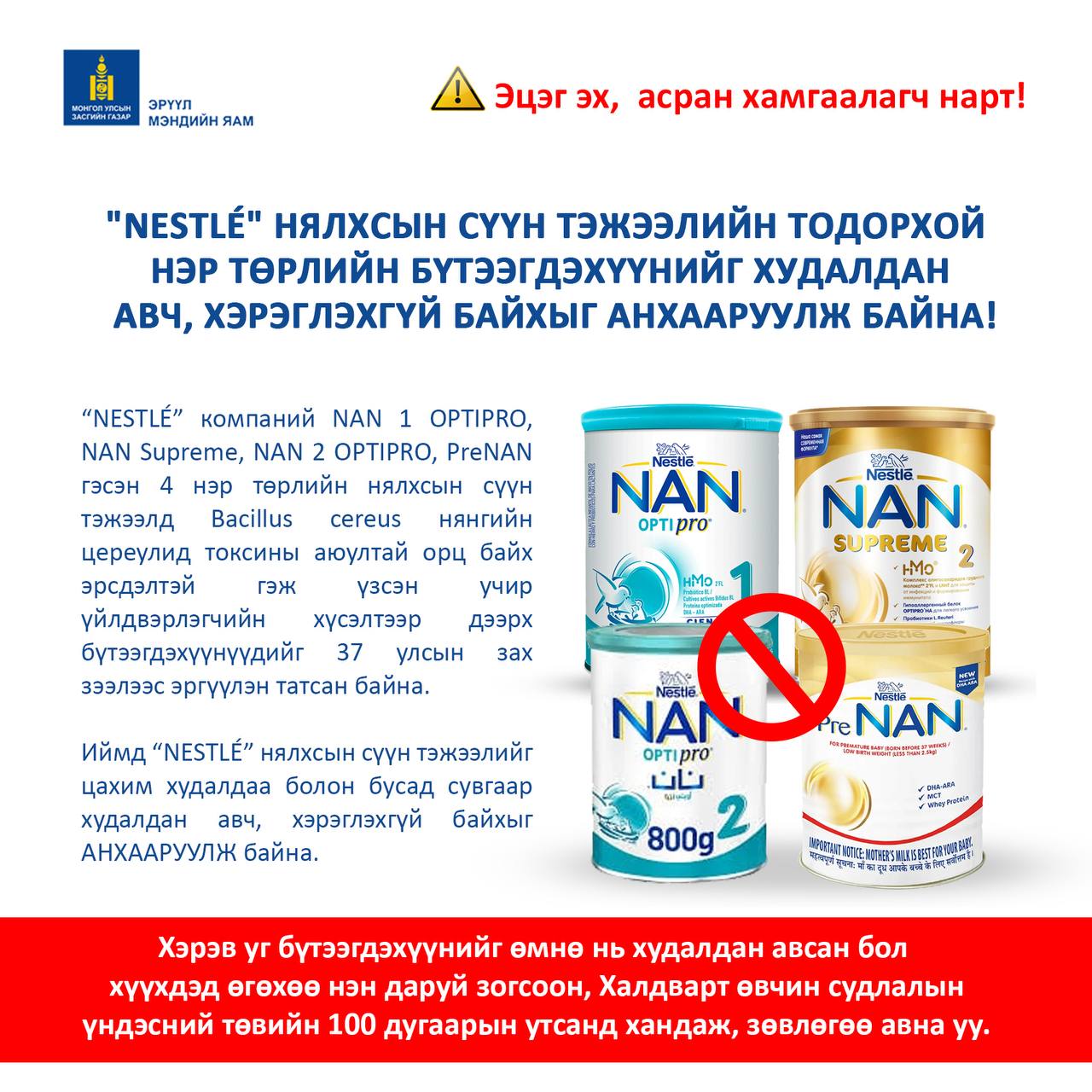 “NESTLÉ” групп нь өөрийн үйлдвэрлэсэн зарим нэр төрлийн нялхсын сүүн тэжээлд Bacillus cereus нянгийн цереулид хэмээх хорт бодис агуулагдаж байх эрсдэлтэй гэж үзэн 2026 оны нэгдүгээр сарын 05-ны өдөр зах зээлээс эргүүлэн татах тухай шийдвэр гаргасан. Уг шийдвэрийн дагуу Монгол Улсад худалдаалагдаж байгаа цувралын дугаар бүхий дараах 4 төрлийн нялхсын сүүн тэжээлийг зах зээлээс эргүүлэн татах арга хэмжээг авсан. Үүнд: