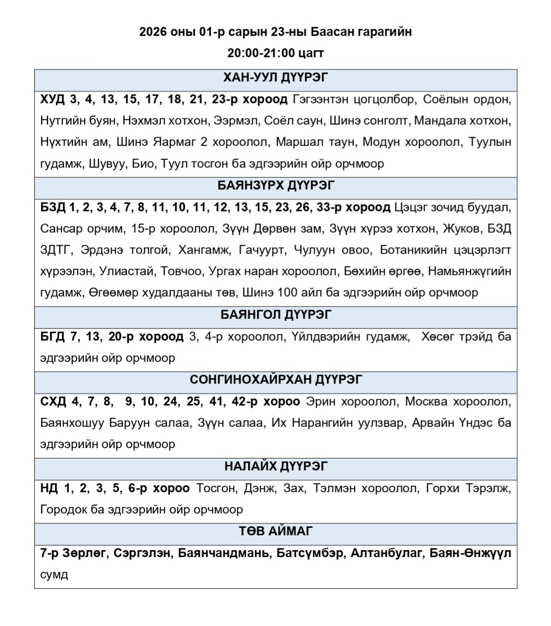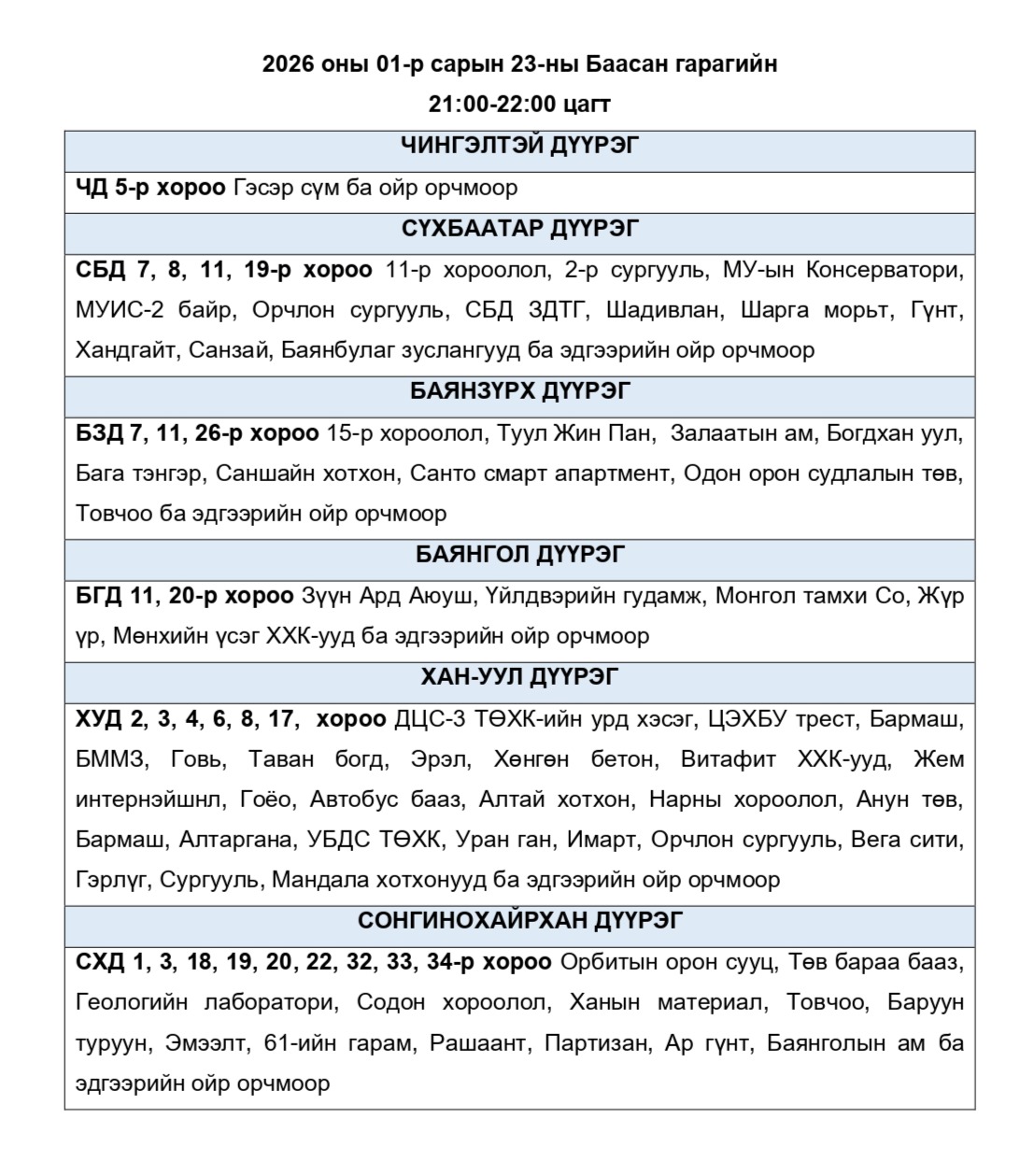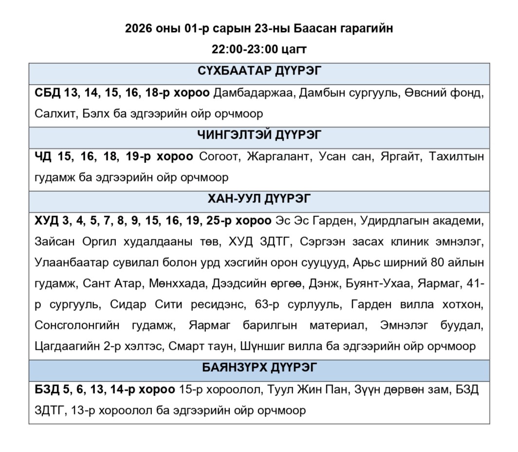 Эрчим хүчний чадлын дутагдлаас шалтгаалан 2026 оны нэгдүгээр сарын 23-ны баасан гарагт цахилгаан эрчим хүчний “хязгаарлалт хийж болзошгүй” байршлуудын хуваарийг Улаанбаатар цахилгаан түгээх станцаас мэдээллээ. Тус газраас “Эрчим хүчний системийн тасралтгүй, найдвартай байдлыг хангахын тулд дараах цагуудад зайлшгүй шаардлагатай бус цахилгаан хэрэгслүүдээ унтрааж, тогоо тохируулахыг иргэд, аж ахуйн нэгжүүдэд уриалж байна. Эрчим хүчний системд аваарын горим үүсэхээс сэргийлэн нийслэлийн хэмжээнд тодорхой байршлуудад цахилгаан эрчим хүчний төлөвлөсөн хэрэглээг “Диспетчерийн үндэсний төв” ТӨХХК-ийн шийдвэрээр хуваарийн дагуу 1-ээс 1 цаг 30 минутын хугацаатайгаар хязгаарлах арга хэмжээ авч байна. Эрчим хүчний эх үүсвэрт үүссэн техникийн гэмтэл, хүндрэлийг сэргээхээр хүндрүүлсэн нөхцөлд ажиллаж буй эрчим хүчний салбарын инженер техникийн ажилтнууд болон салбарын нөхцөл байдлыг бодитоор хүлээн авч ойлгон, тогоо тохируулж буй хүн бүрд талархал илэрхийлье” гэжээ.