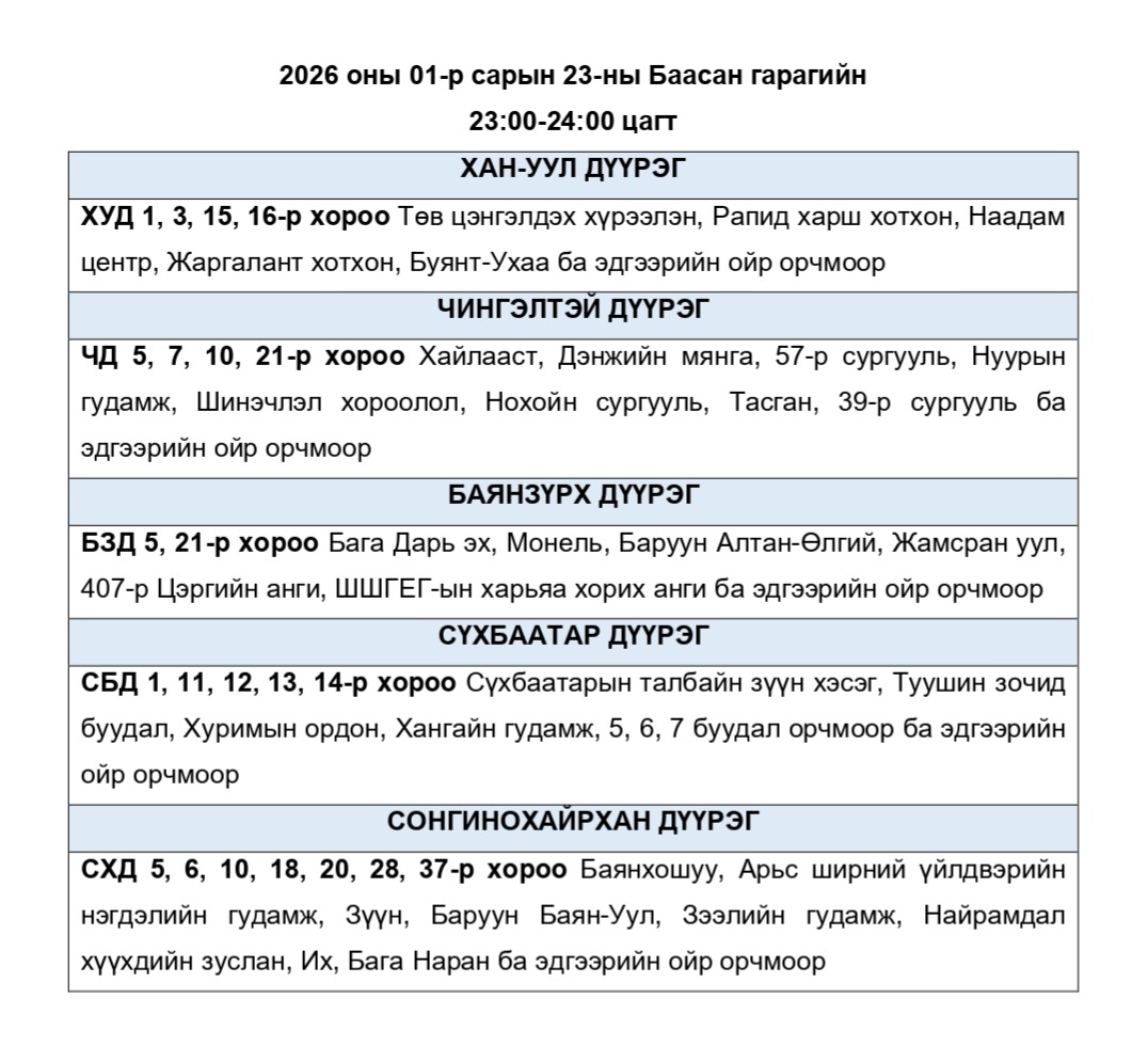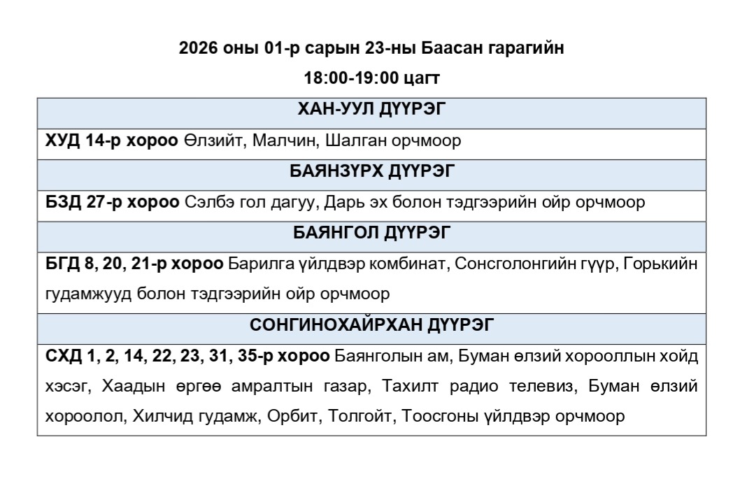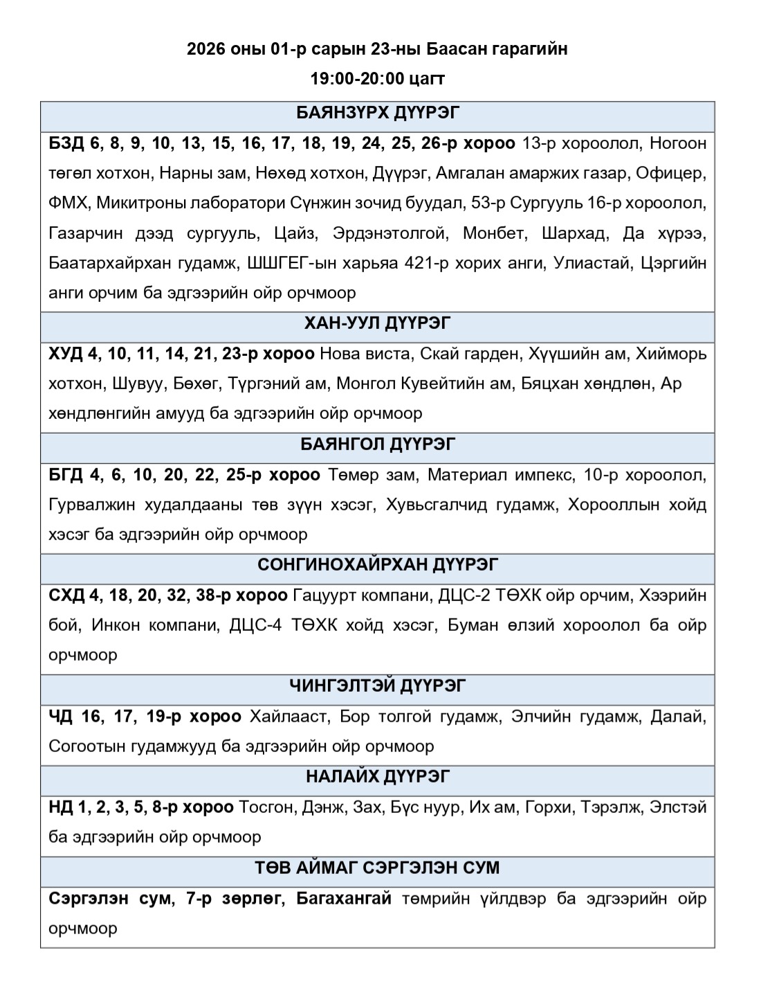 Эрчим хүчний чадлын дутагдлаас шалтгаалан 2026 оны нэгдүгээр сарын 23-ны баасан гарагт цахилгаан эрчим хүчний “хязгаарлалт хийж болзошгүй” байршлуудын хуваарийг Улаанбаатар цахилгаан түгээх станцаас мэдээллээ. Тус газраас “Эрчим хүчний системийн тасралтгүй, найдвартай байдлыг хангахын тулд дараах цагуудад зайлшгүй шаардлагатай бус цахилгаан хэрэгслүүдээ унтрааж, тогоо тохируулахыг иргэд, аж ахуйн нэгжүүдэд уриалж байна. Эрчим хүчний системд аваарын горим үүсэхээс сэргийлэн нийслэлийн хэмжээнд тодорхой байршлуудад цахилгаан эрчим хүчний төлөвлөсөн хэрэглээг “Диспетчерийн үндэсний төв” ТӨХХК-ийн шийдвэрээр хуваарийн дагуу 1-ээс 1 цаг 30 минутын хугацаатайгаар хязгаарлах арга хэмжээ авч байна. Эрчим хүчний эх үүсвэрт үүссэн техникийн гэмтэл, хүндрэлийг сэргээхээр хүндрүүлсэн нөхцөлд ажиллаж буй эрчим хүчний салбарын инженер техникийн ажилтнууд болон салбарын нөхцөл байдлыг бодитоор хүлээн авч ойлгон, тогоо тохируулж буй хүн бүрд талархал илэрхийлье” гэжээ.