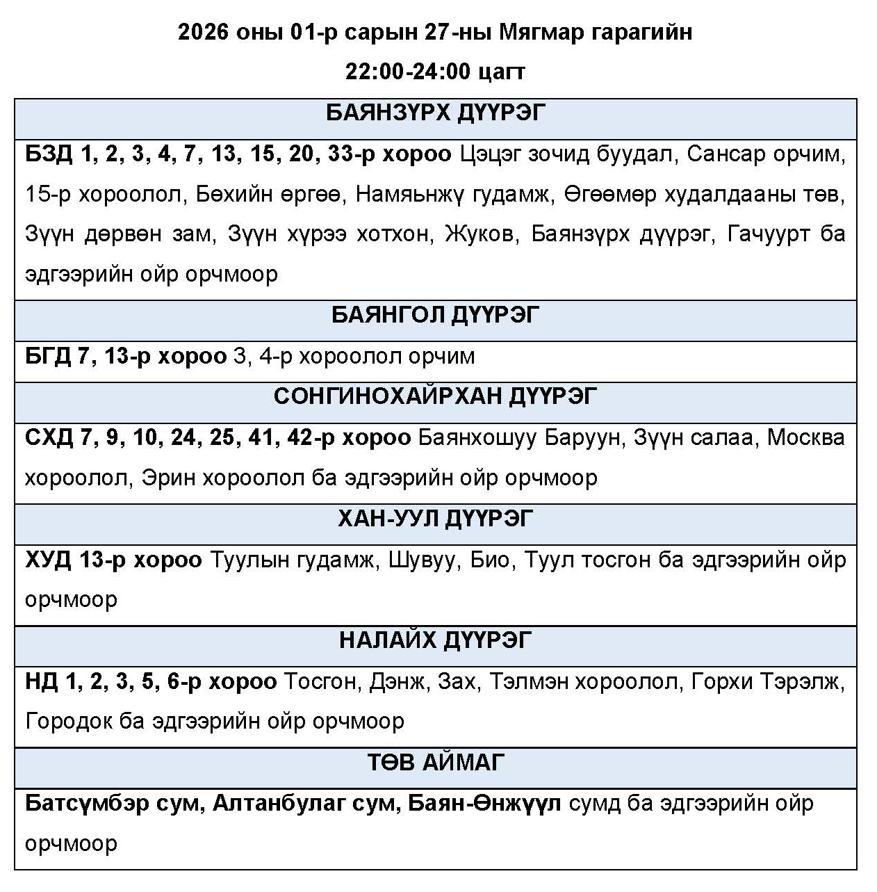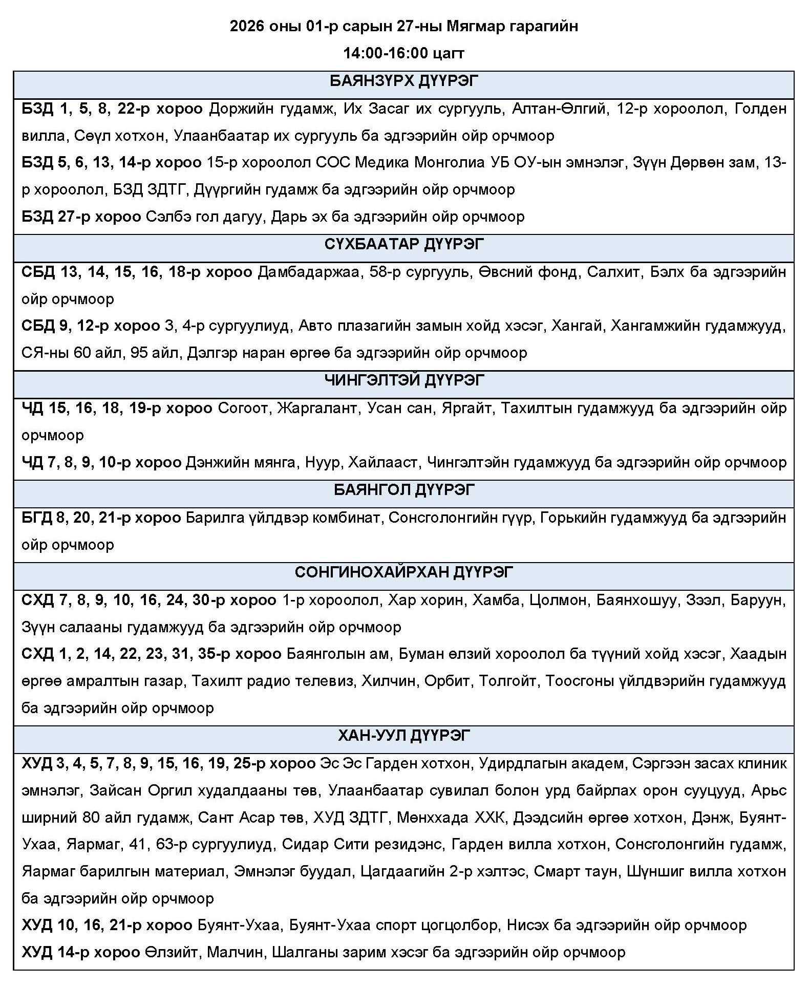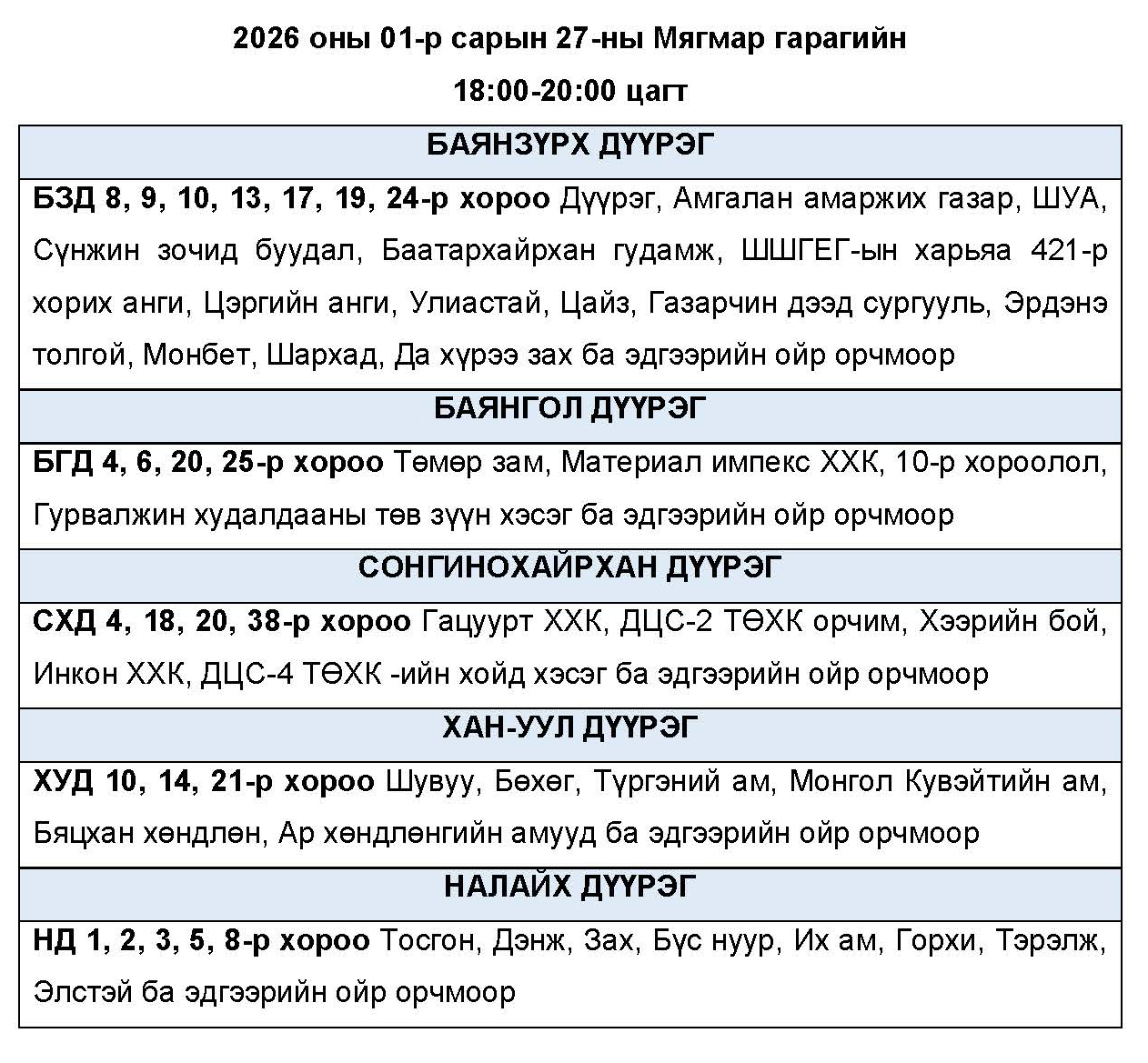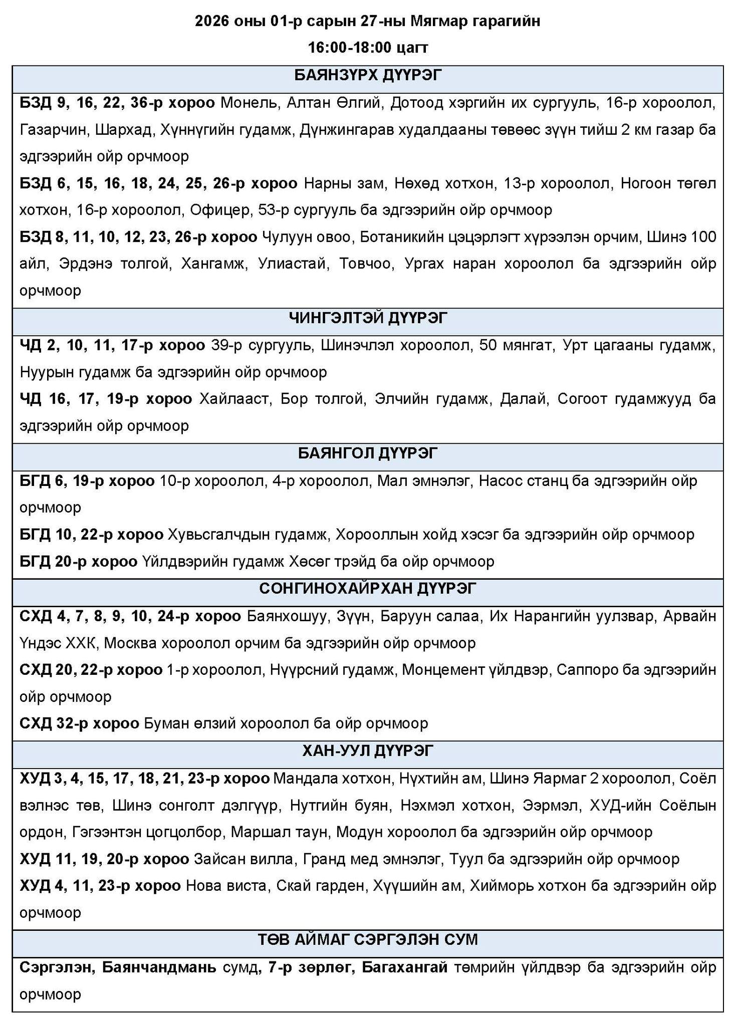 Өнөөдөр буюу 2026 оны нэгдүгээр сарын 27-ны мягмар гарагт цахилгаан эрчим хүчний “ХЯЗГААРЛАЛТ ХИЙХ” байршлуудын хуваарийг танилцуулж байна.