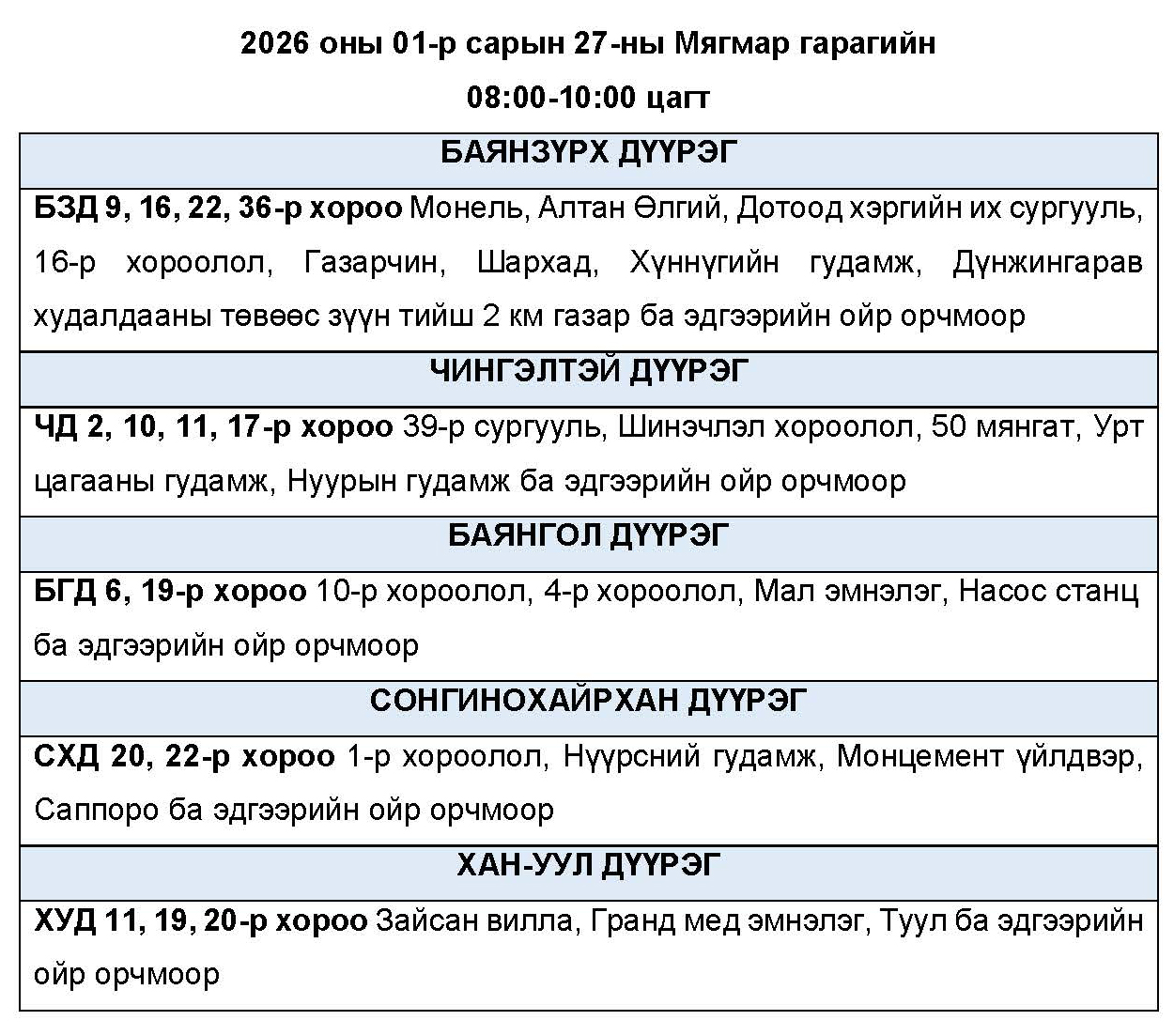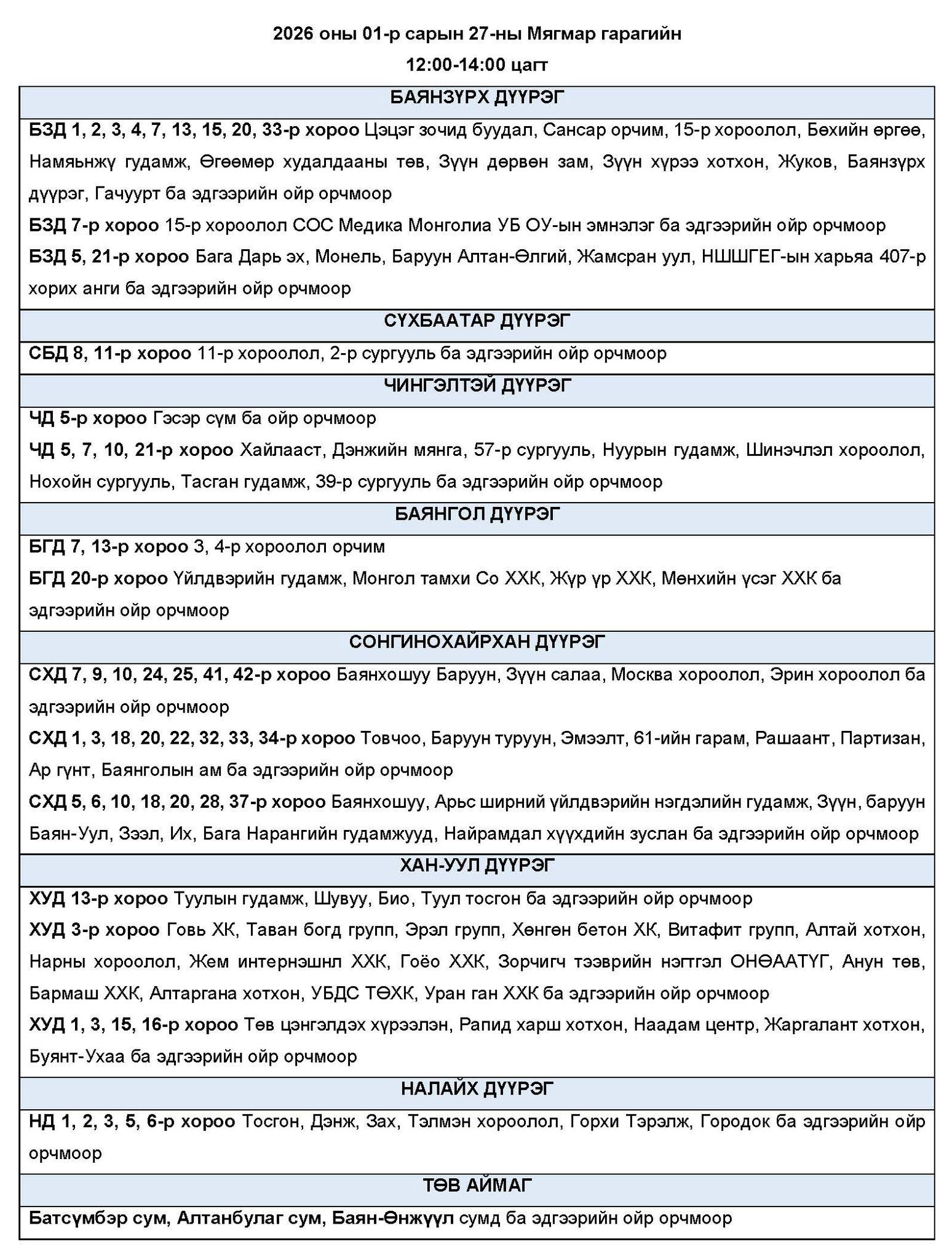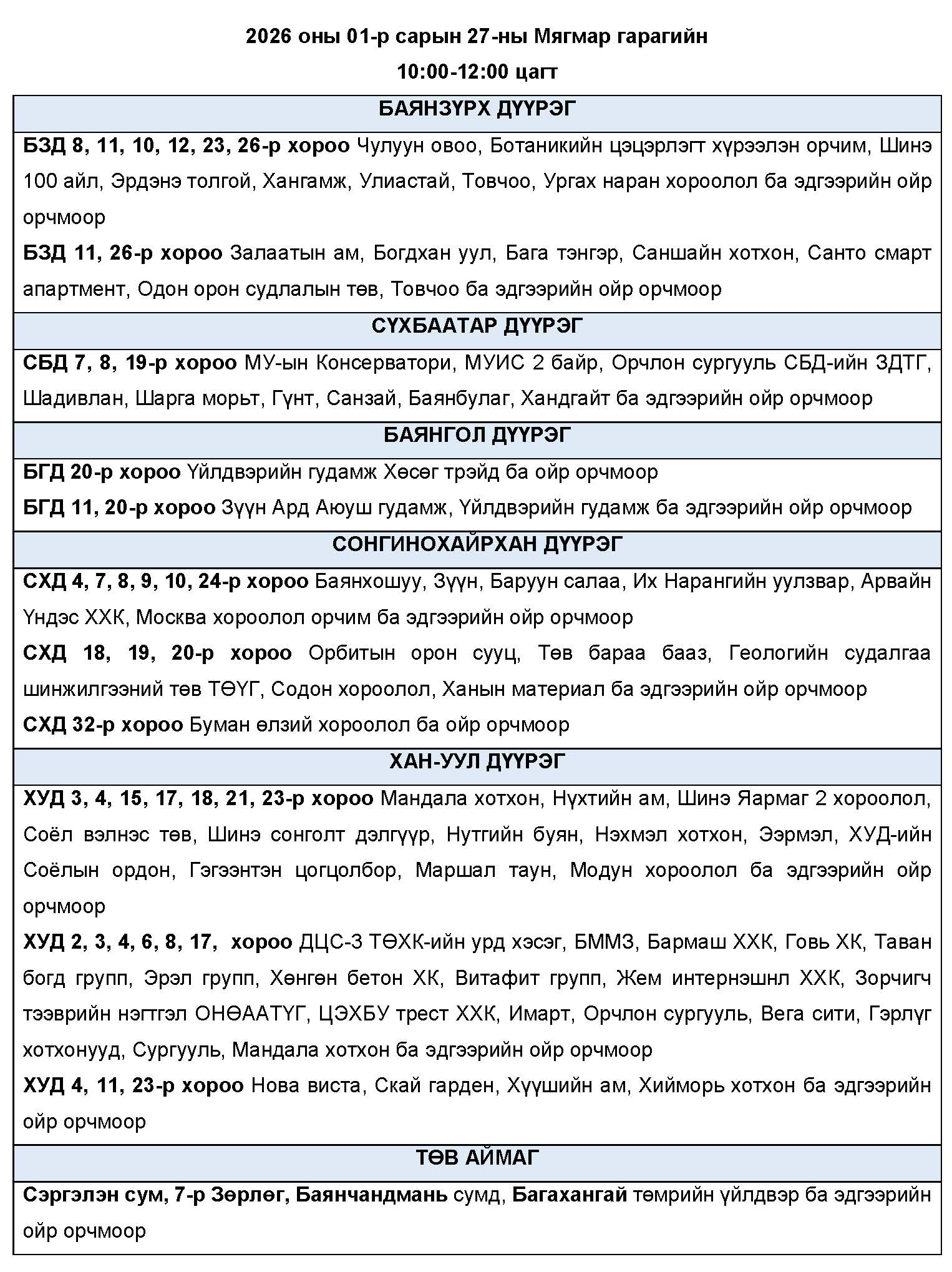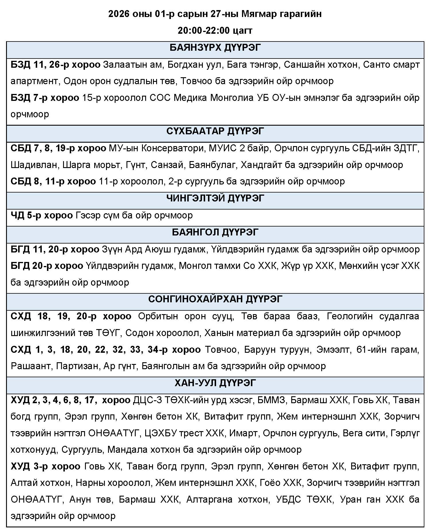 Өнөөдөр буюу 2026 оны нэгдүгээр сарын 27-ны мягмар гарагт цахилгаан эрчим хүчний “ХЯЗГААРЛАЛТ ХИЙХ” байршлуудын хуваарийг танилцуулж байна.