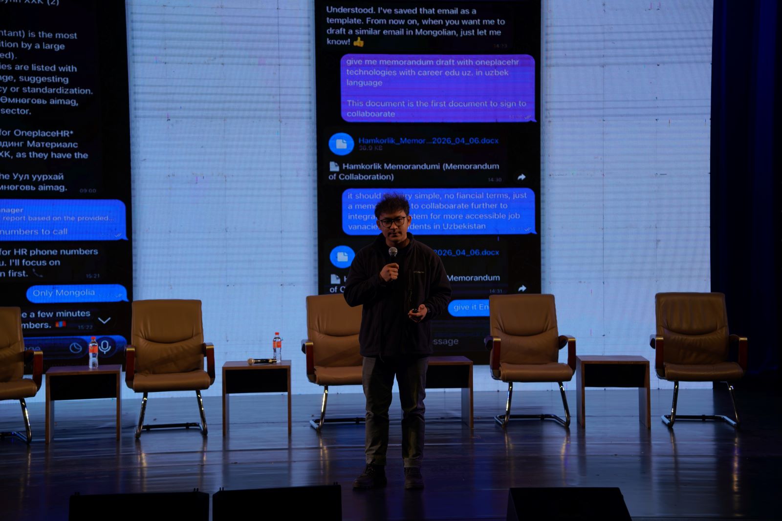 Гэр бүл, хөдөлмөр, нийгмийн хамгааллын яамны зөвлөх Д.Эрдэнэбат “Зүгээр ажиглаад сууж байх цаг ард хоцорчээ. Бид асар хурдан өөрчлөгдөж байгаа ертөнцийн дунд амьдарч байна. Гагцхүү тасралтгүй суралцаж байгаа хүмүүс л ирээдүйг бүтээх болжээ. Хиймэл оюун, робот нэвтэрснээр бүх юмны үнэ буурна. Учир нь тэд 24 цаг тасралтгүй ажиллана. Нэгжийн өртөг хямд болж байна. Ингэхээр дэлхий түүхэндээ анх удаа өлсгөлөнгөөс гарах нь. Энэ бол сайн мэдээ. Нөгөө талаас оюутнууд ажлын байран дээр гарахаар хоорондоо биш, америк, хятад мэргэжилтнүүдтэй биш хиймэл оюунтай өрсөлдөх болж байна. Тэгэхээр гарцаа байхгүй эзэмших болж байгааг анхаараарай. Эзэмшсэн хүн нь илүү бүтэмжтэй ажиллаж, илүү орлоготой болно. Хиймэл оюуны эрин зуунд заавал ухаантай байх шаардлагагүй болж байгаа. Ухааныг хиймэл оюун ухаан орлоно. Үүнийг сайн ашиглаж чадвал орлого олох боломжтой болж байна гэсэн үг. Нийт хүмүүсийн 80 орчим хувь нь ганцхан хиймэл оюун ашиглаж байна. Зорилгоосоо хамаараад маш олон төрөл бий. Боломжийг нь дүүрэн ашиглах хэрэгтэй. Ажлын байр маш хурдан хувиран өөрчлөгдөнө. Тэгэхээр байнга суралцах шаардлагатай болж байна. Хиймэл оюунаас бүү ай. Энэ айдсаа даваад ирэхэд огт өөр шинэ ертөнц таныг угтана” гэж зөвлөлөө.
