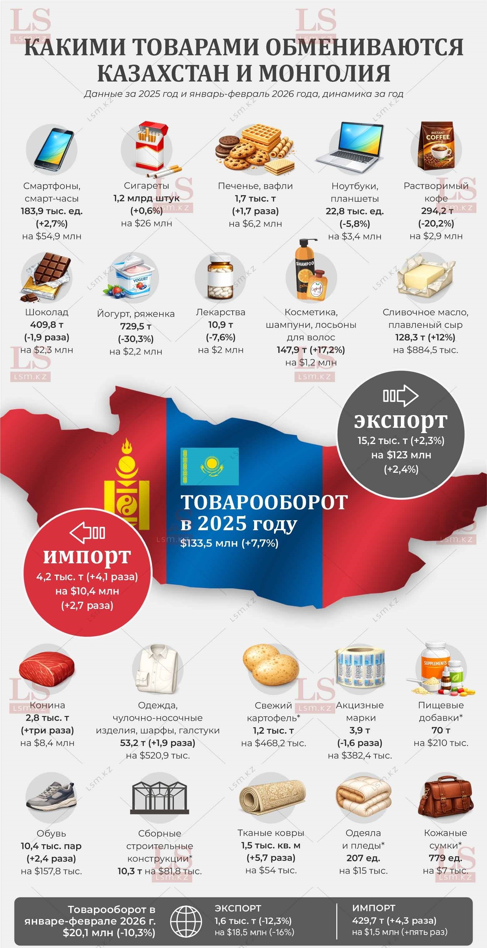 Мөн Казахстан улс манайхаас төмс (1,2 мянган тонн), хүнсний амтлагч (70 тонн), арьс, савхин цүнх (779 ширхэг), одеял, бүтээлэг (207 ширхэг), барилгын материал (10,3 тонн) авсан байна.