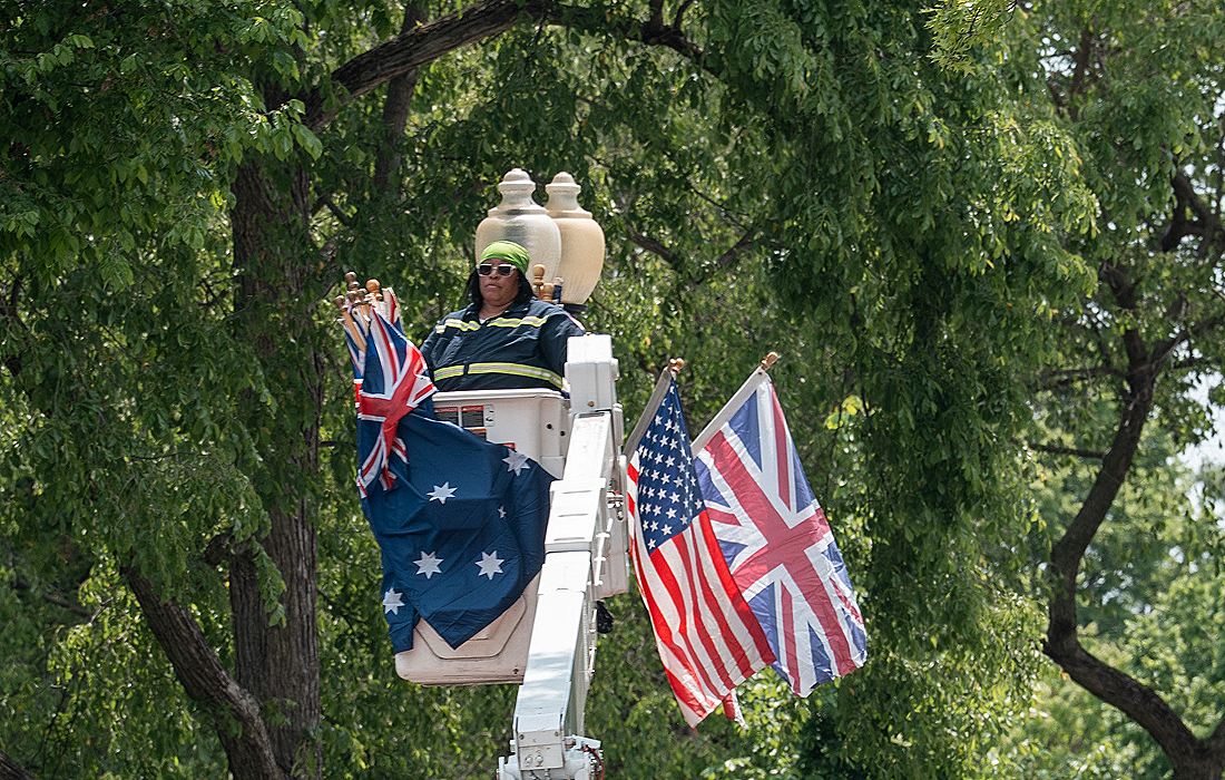 Чарльз III хааны айлчлалыг угтан гудамжаа гоёсон ч андуураад Австралийн далбааг өлгөжээ. Буруу далбааг буулгаж байгаа нь. Andrew Leyden/Getty Images